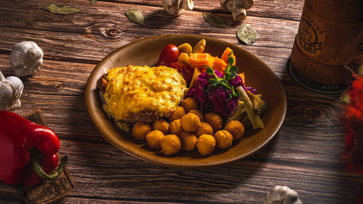 lielais kartupeļu plācenis ar kūpinātu cūkas fileju, sīpoliem un krējumu
