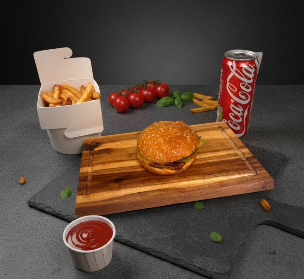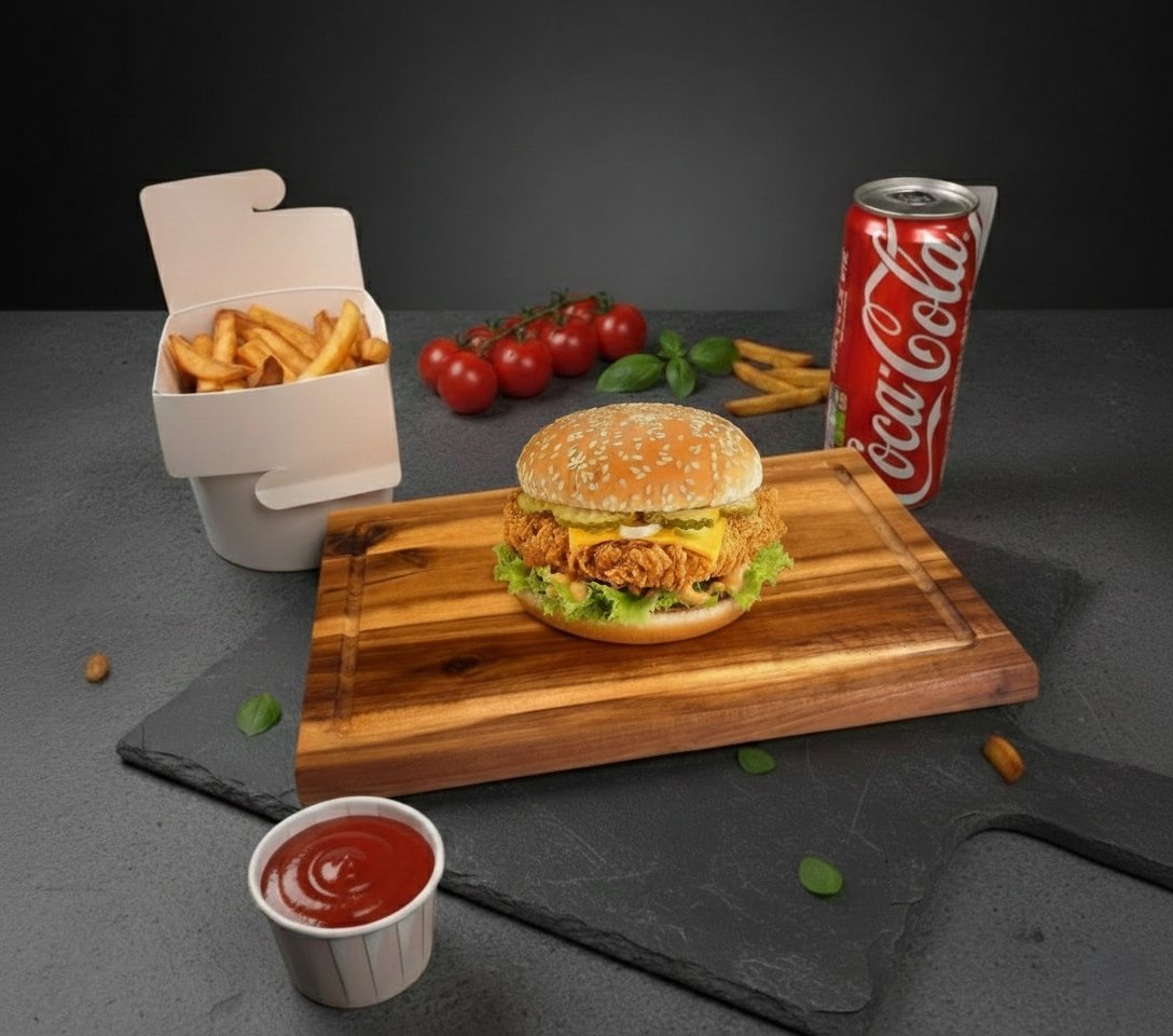 Trio burgers + frī kartupeļi + dzēriens