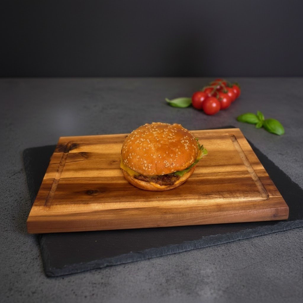 Grilēta liellopa gaļa, burgermaize, aisberga salāti, tomāts, marinēti gurķi, Čedaras siers un burgeru mērce