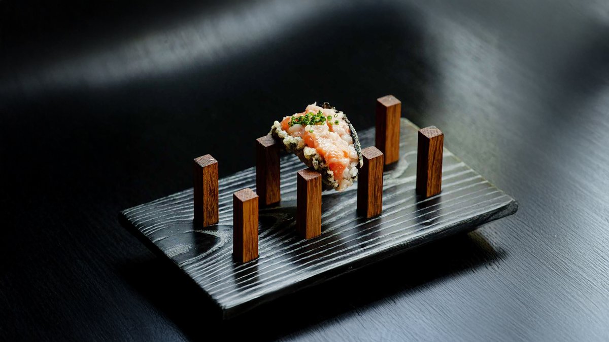 Suši rīsi, lasis, vakame, avokado, šitaki mērce, ingvērs, marinēti violēti sīpoli, tobiko