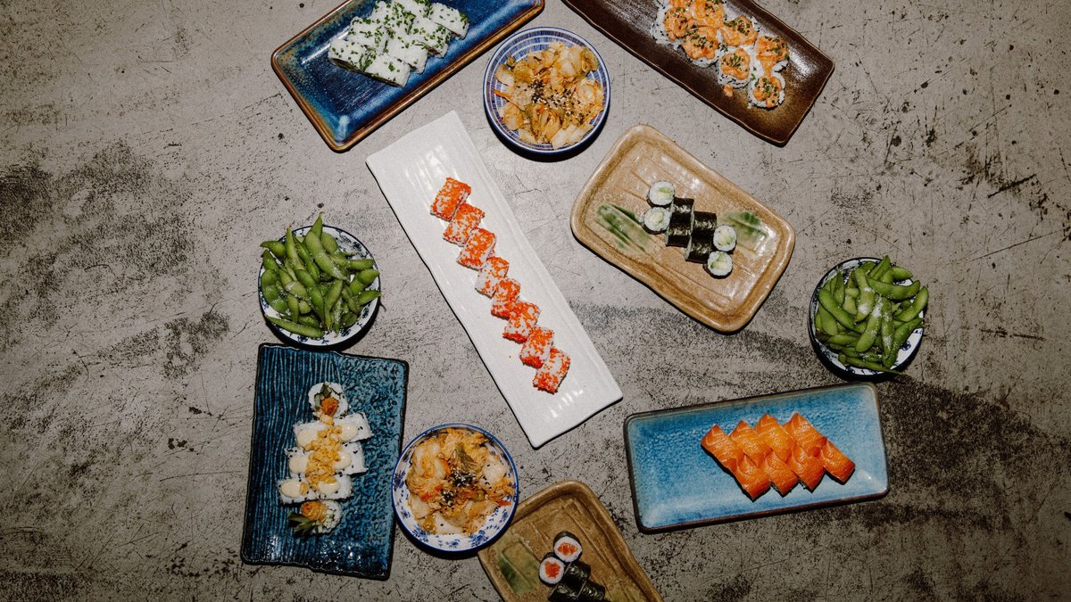 Suši rīsi, lasis, tuncis, jūras ķemmītes, kūpinats zutis, avokado, terijaki mērce, maurloki, sezama sēklas, tobiko ikri, vasabi, marinēts ingvers