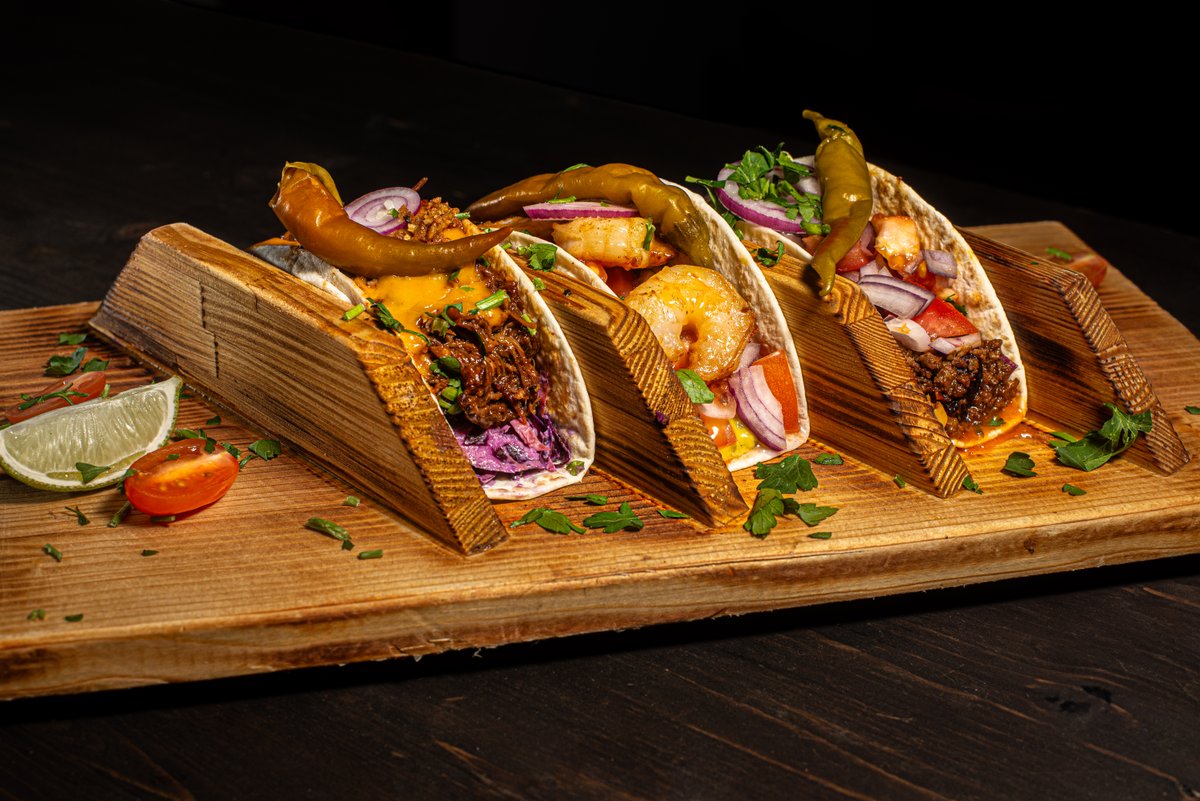 ar coleslaw salātiem, marinētiem sīpoliem, čedaras siera mērci un grauzdētiem sīpoliem *Attēlā tako TRIO