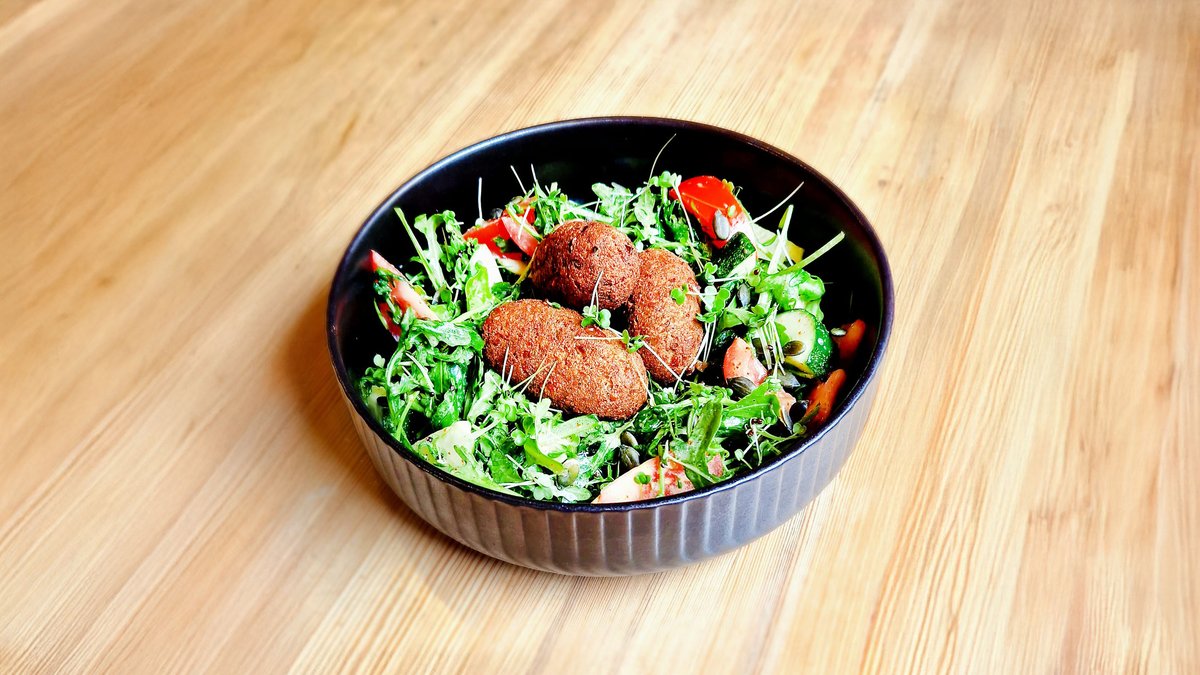 Falafels, svaigie salāti, tomāti, gurķi, burkāni korejas gaumē, mērces