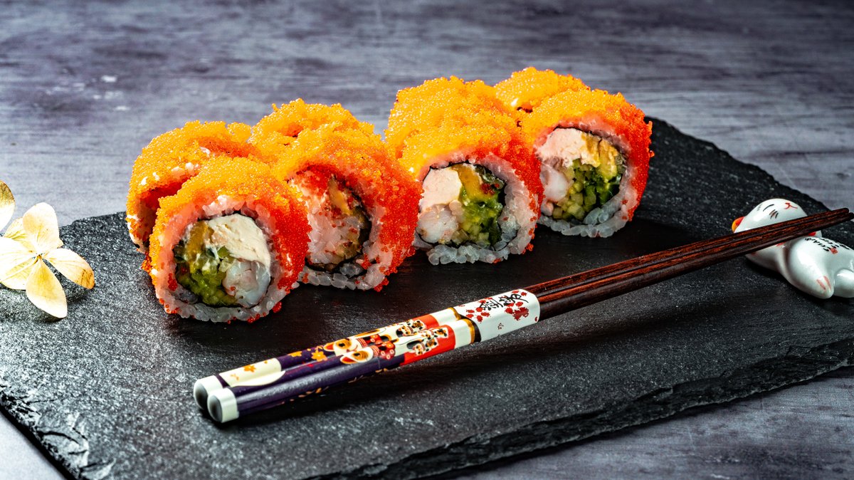 Garneles,avokado,krēmsiers,masago ikri,siers gauda,unagi mērce