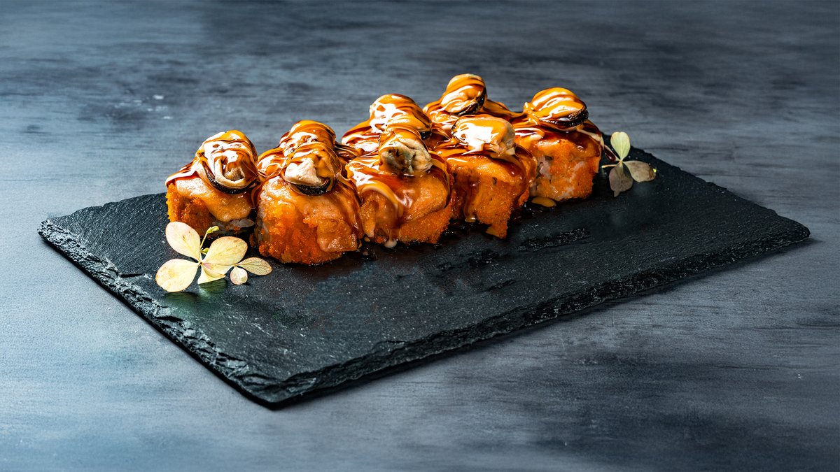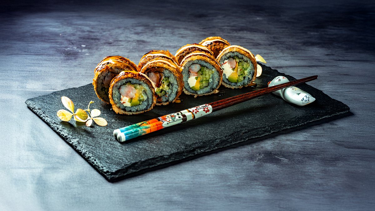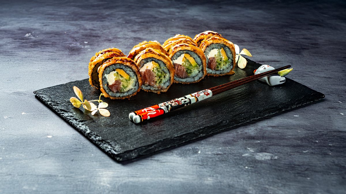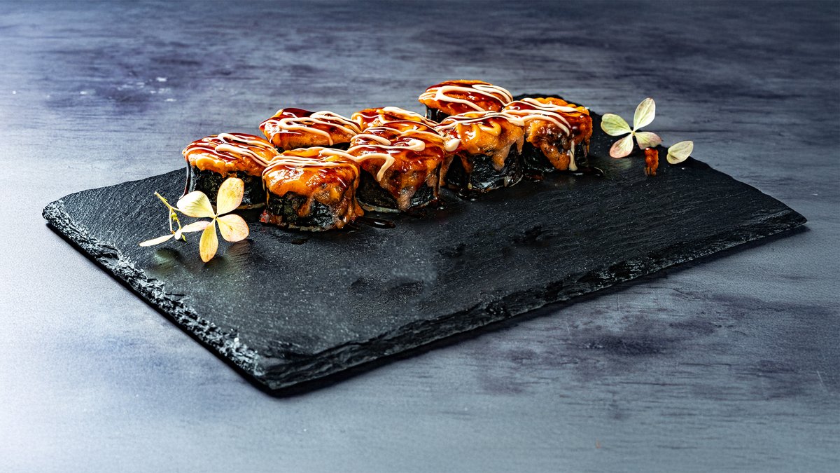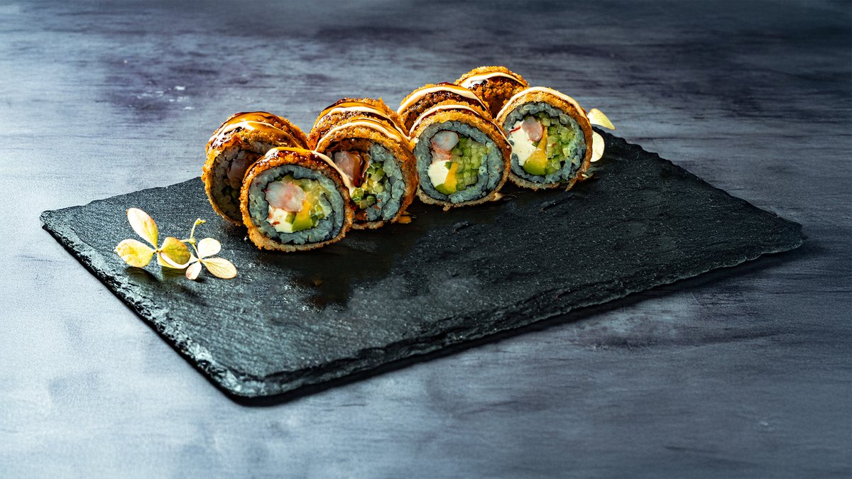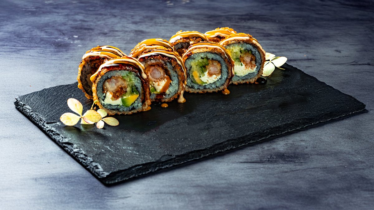Tīģergarneles tempūrā,avokado,gurķis,krēmsiers,unagi mērce
