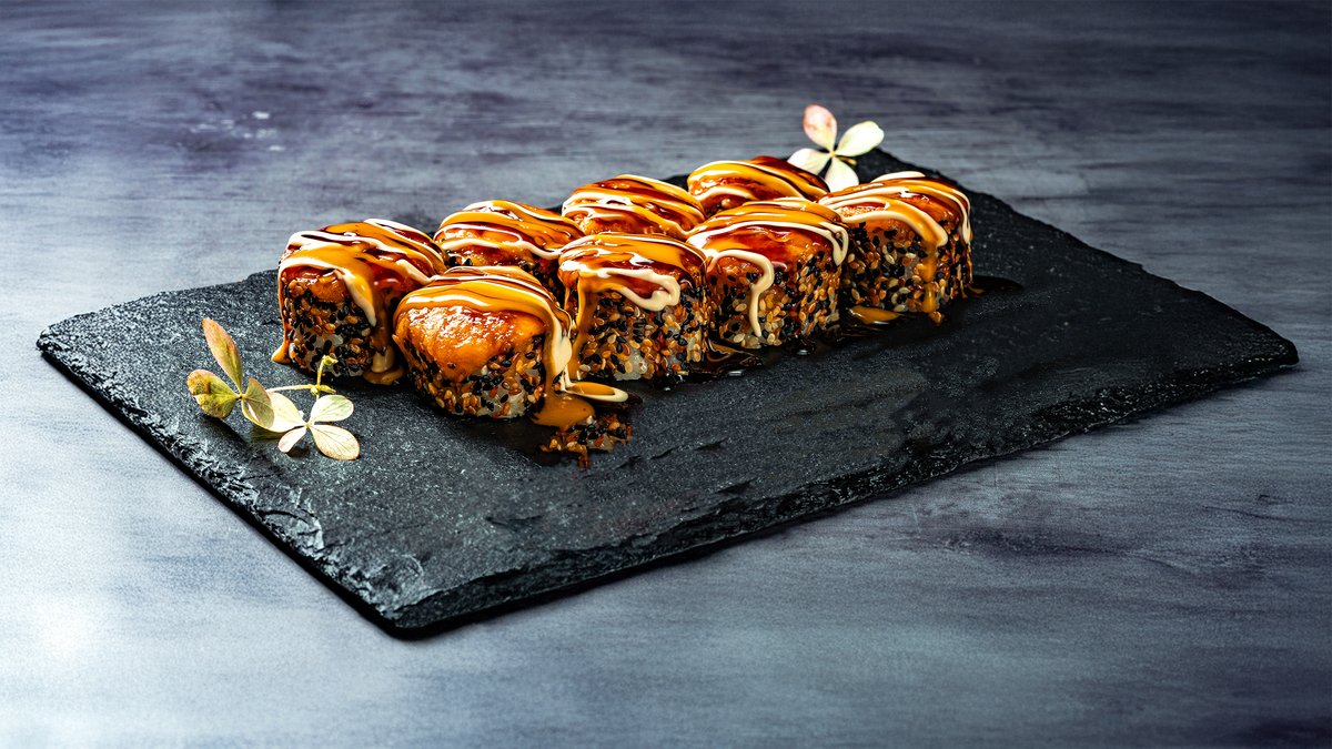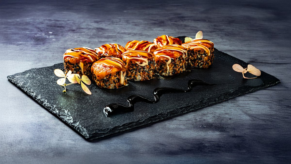 Tīģergarneles,siers gauda,krēmsiers,melnais sezams,unagi mērce