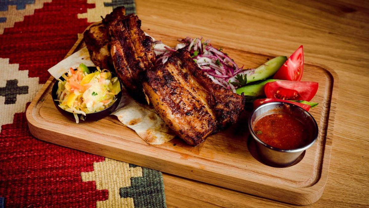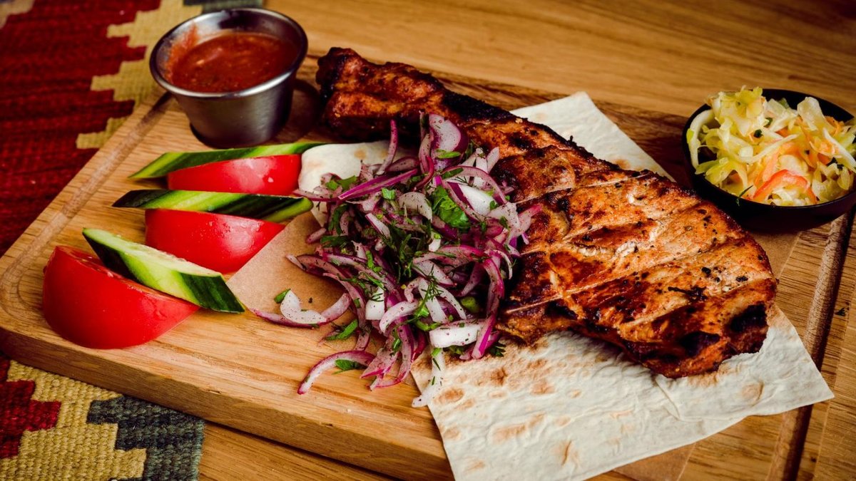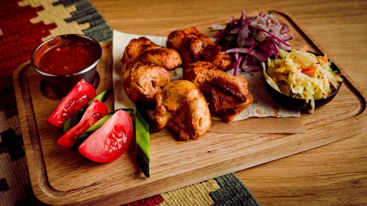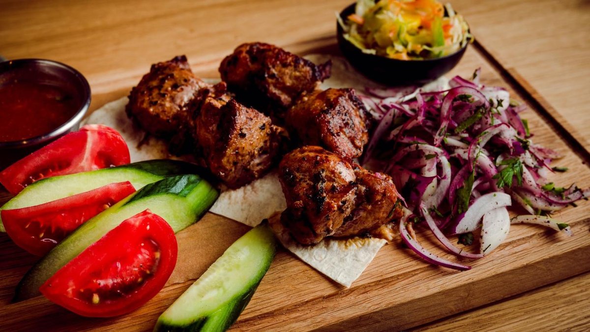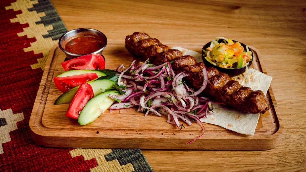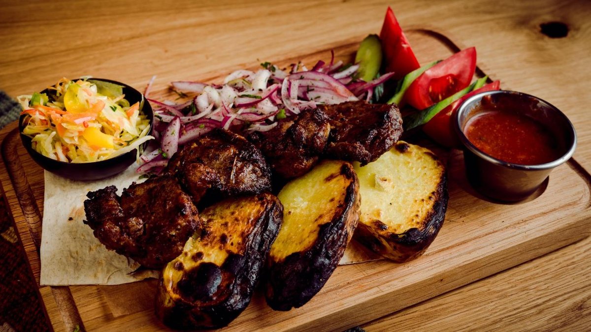 Ļuļa kebabs ar vistas gaļu, vistas šašliks, cūkgaļas kakla karbonāde, ļuļa kebabs ar jēra gaļu, cūkas ribiņas, frī kartupeļi. 4-5 personām