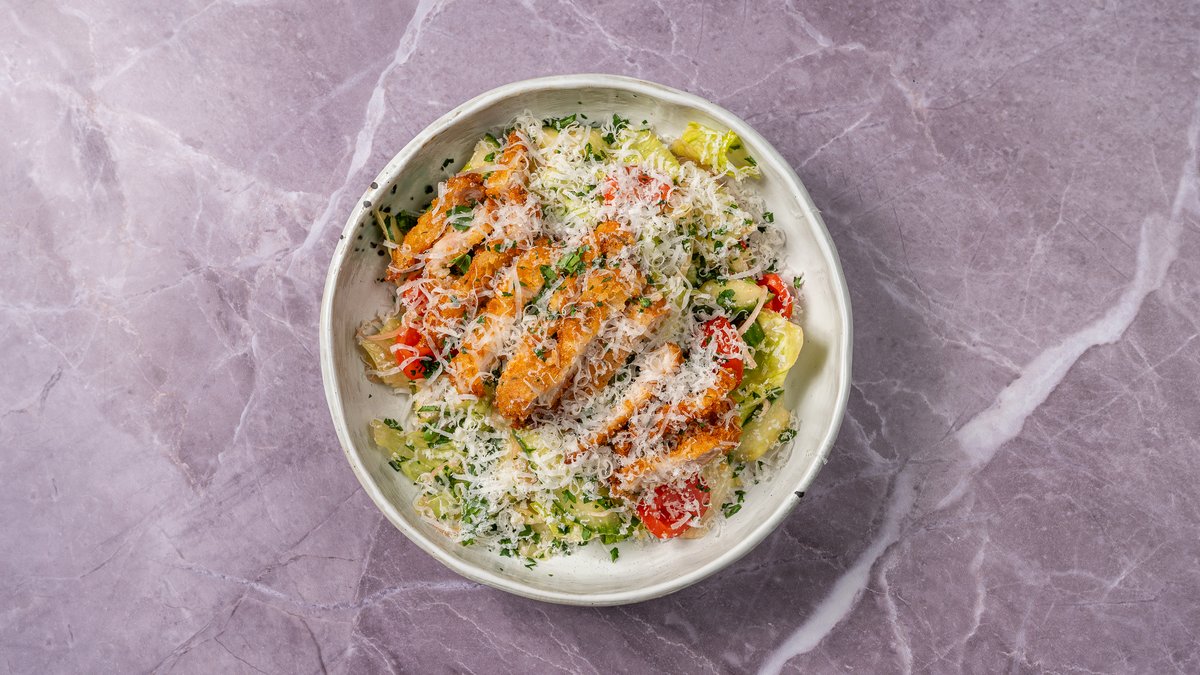 Kraukšķīgā vista, little gem salāti, grilēta sarkanā paprika, cherry tomāti, gurķi, sherry etiķa vinegrets, parmezāns