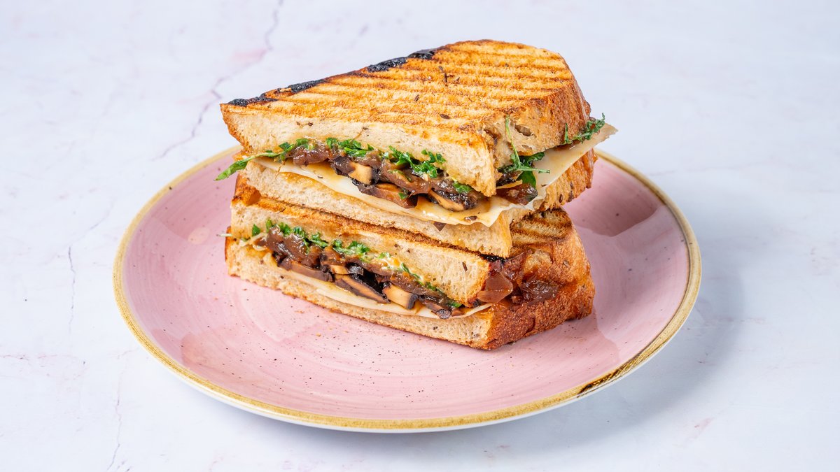 Portobello sēņu - karamelizētu sīpolu sendvičs