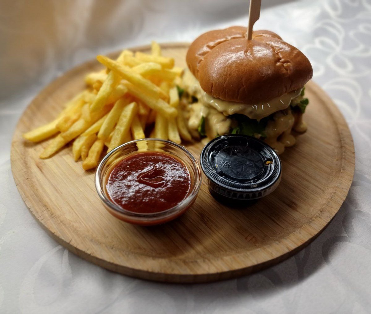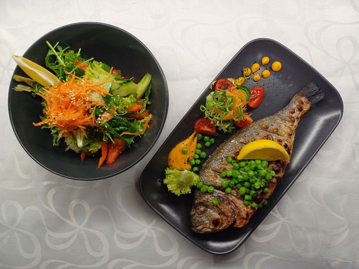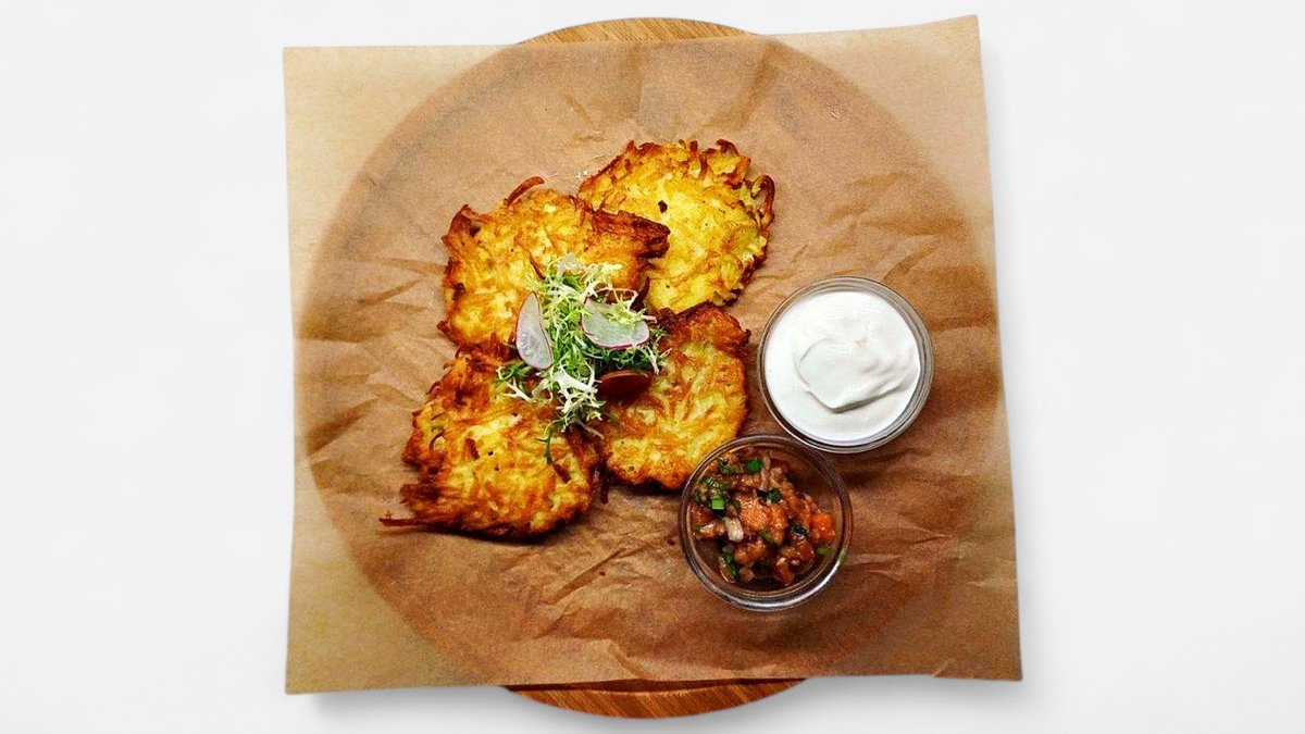 Kartupeļu pankūkas, laša tartars, skābais krējums