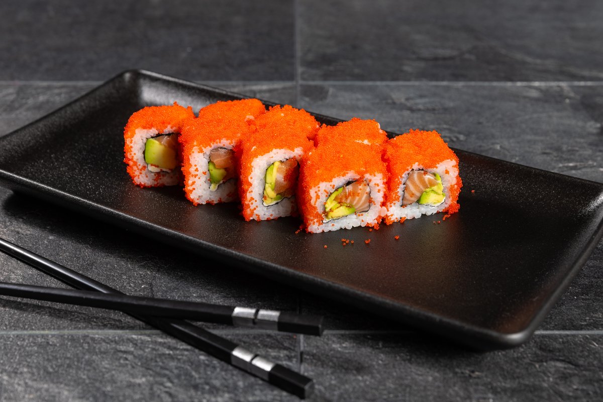 Fritēta garnele, avokado, pikantā mērce. Cepurītē: lasis, dedzinātā pikantā mērce, teriyaki mērce, sezama sēklas