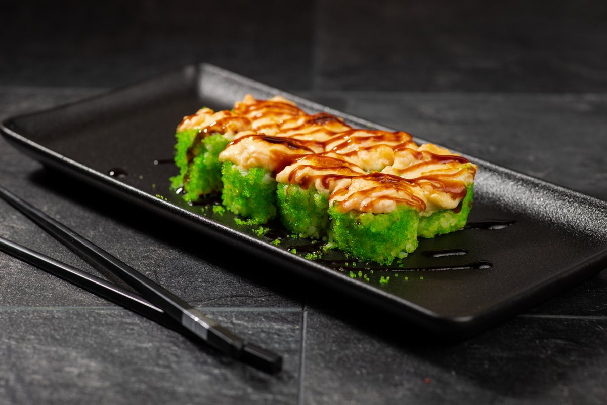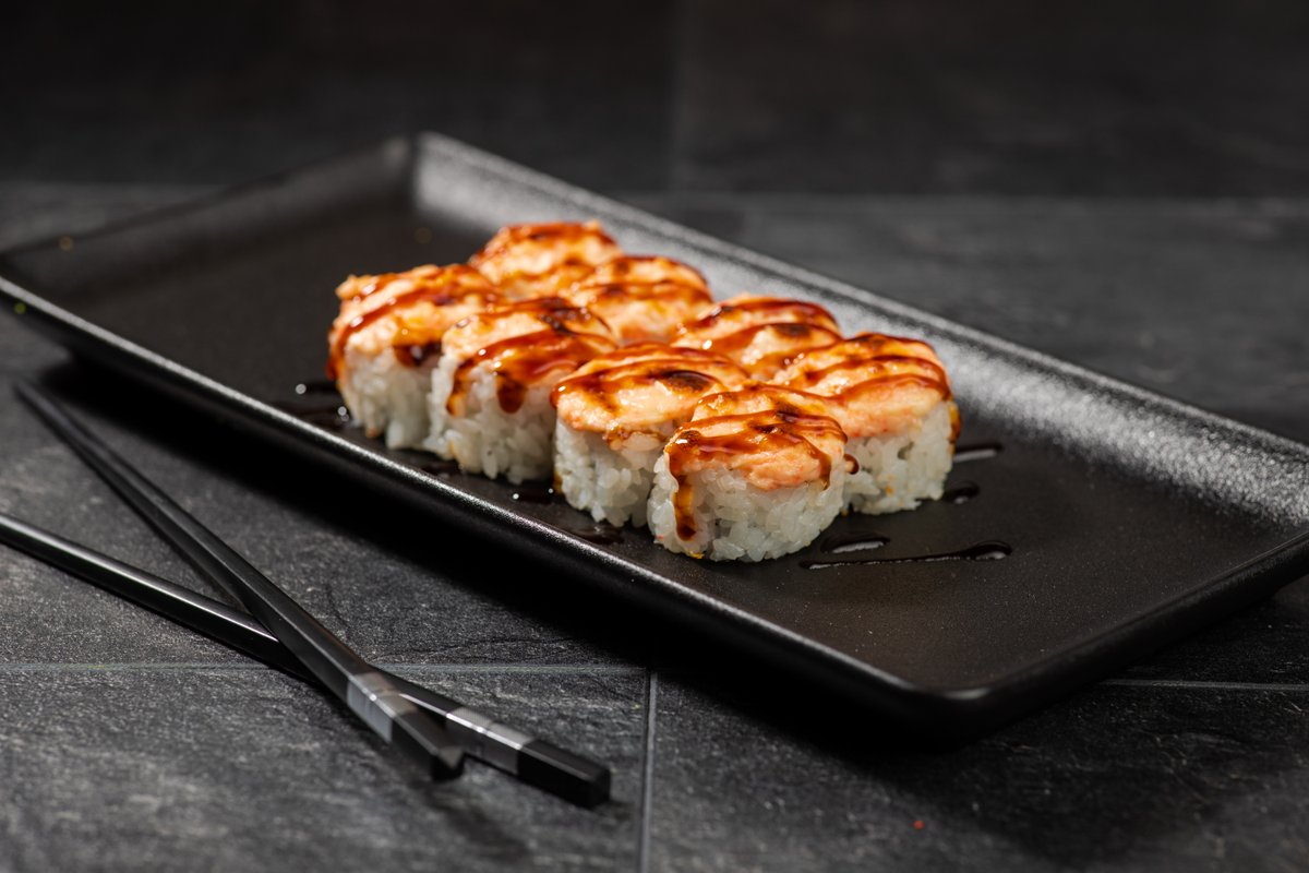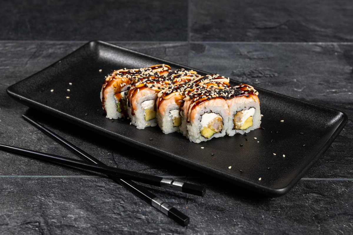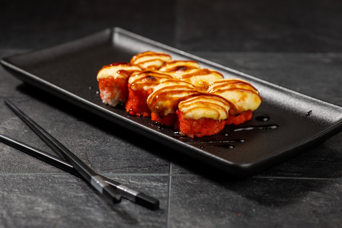 Ziemeļu garnele, krēmsiers, avokado Cepurītē: Ziemeļu garnele, siers, pikantā mērce, teriyaki mērce