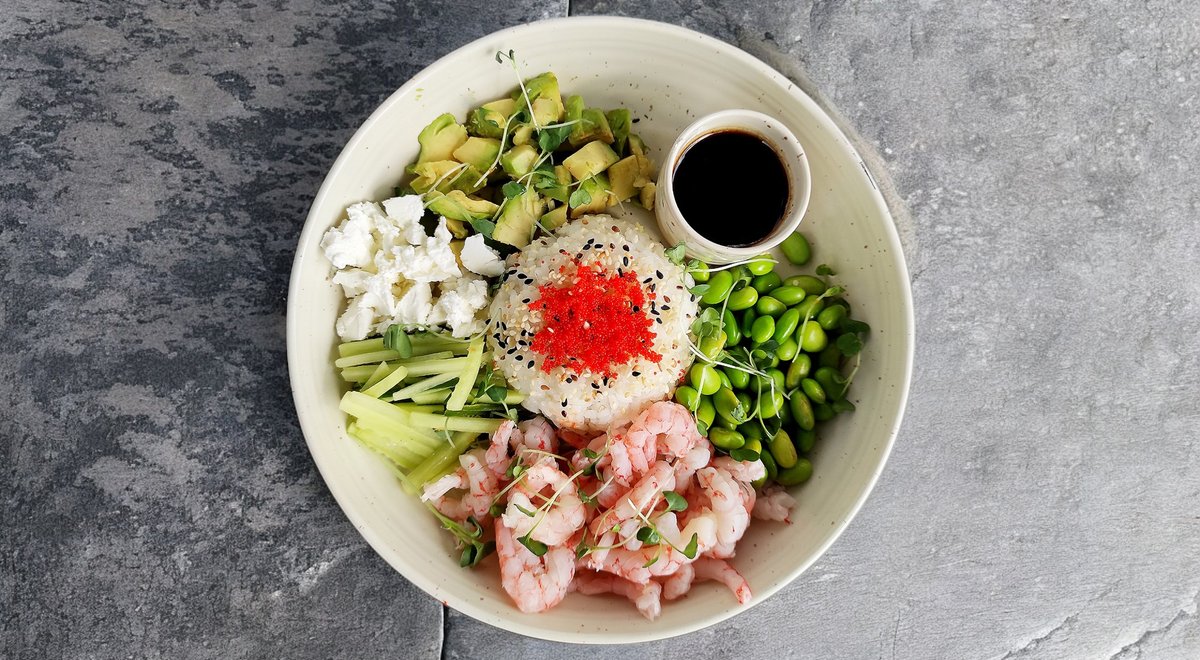Garneles, Feta, avokado, edemame, gurķis, ikri, rīsi