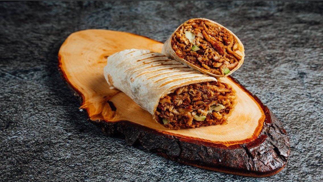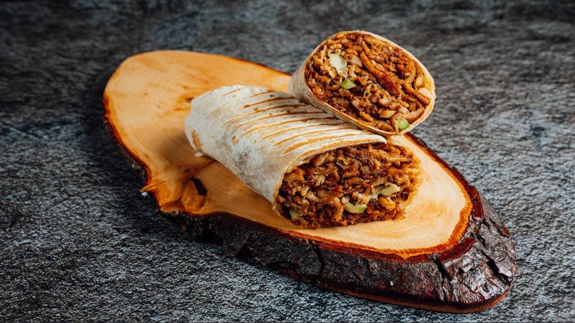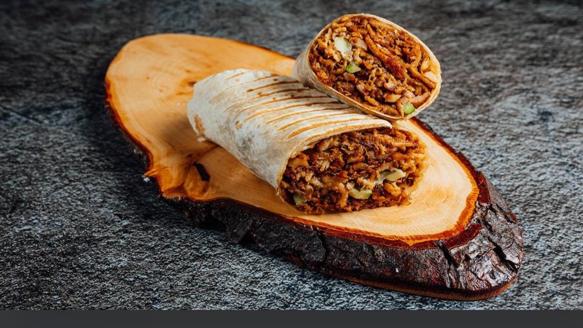 Grileta vistas un Liellopa gala ari saläti un merce, kas ietita tortilja