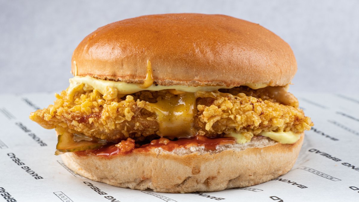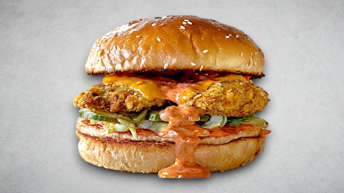 Бургер лепче, бургер сос, ајсберг, кисели краставички, кромид, чедар кашкавал, пилешки стек на скара