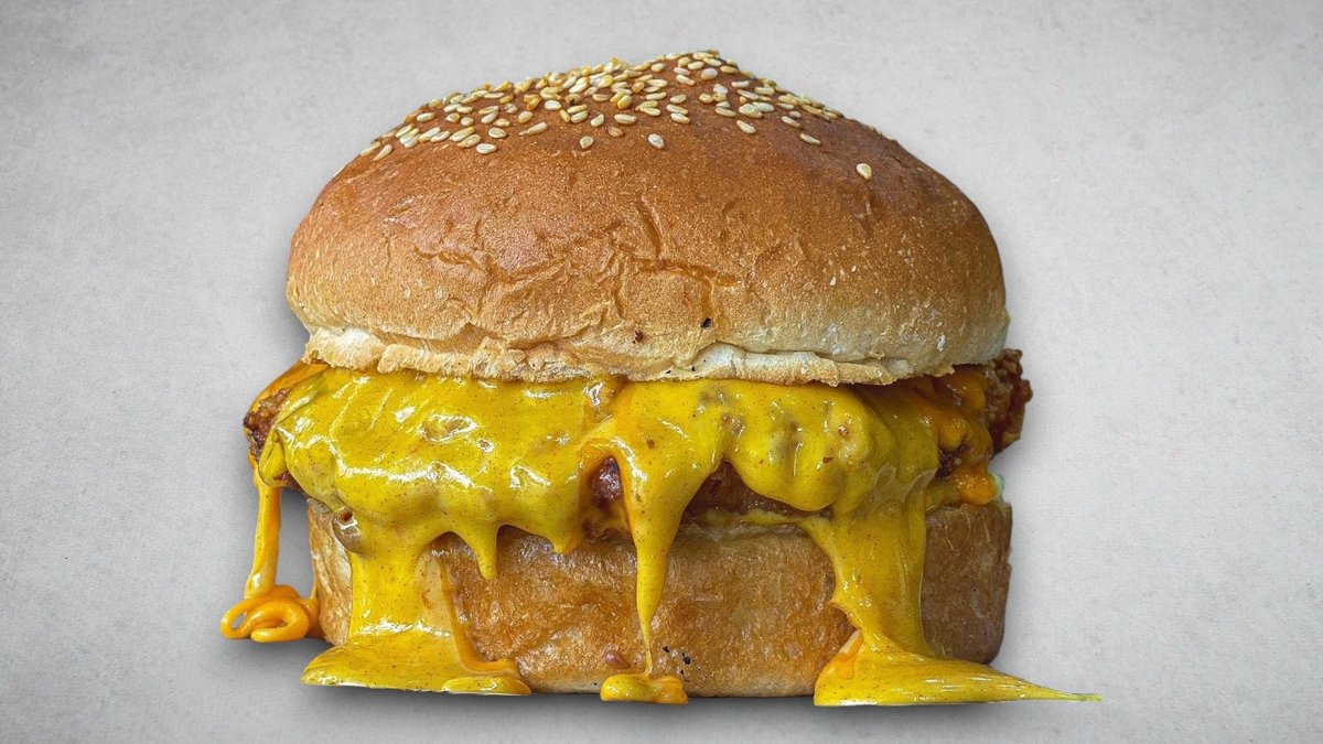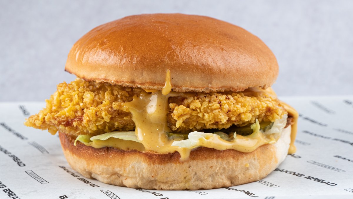 Бургер лепче, поховано пилешко, чедар кашкавал, мед и сенф сос, ајсберг, кисели краставички