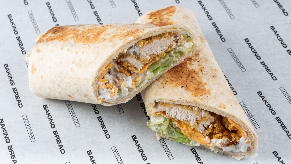 Тортиља, поховано пилешко, бургер сос, чедар кашкавал, ајсберг, кисели краставички