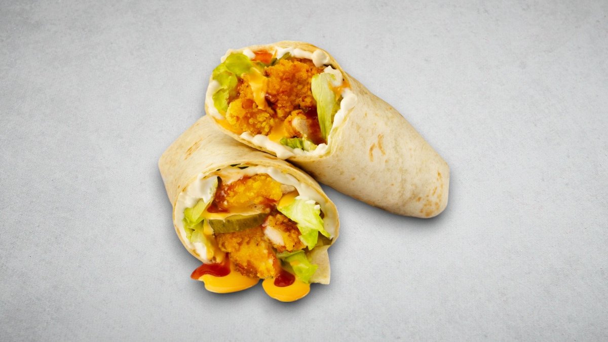 Тортиља, поховано пилешко, мед и сенф сос, чедар кашкавал, ајсберг, кисели краставички