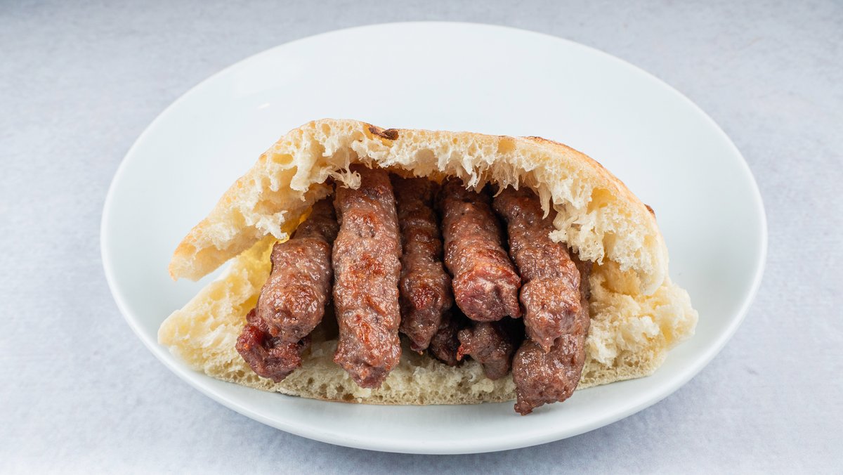 Ќебапи, лепиња, пиперка, кромид