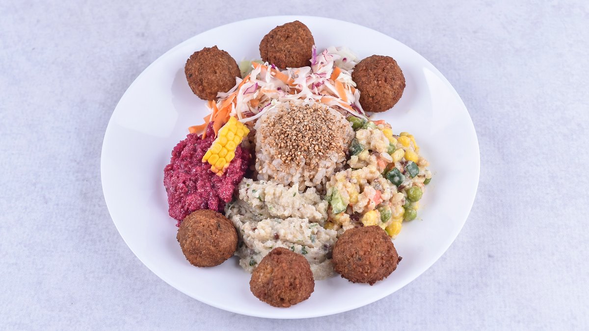 Интегрално лепче; мајонез од житарици; кинеска салата; хумус; крем салата од зеленчук; свежа салата од зелка и морков; фалафел