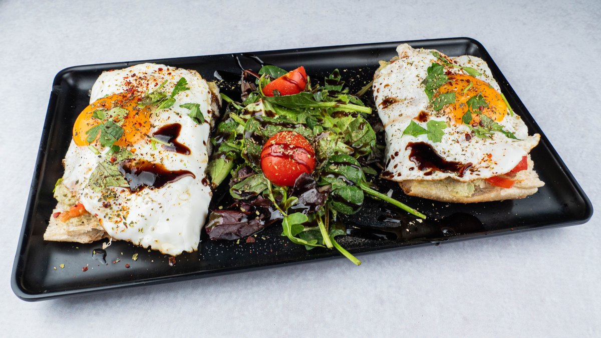 X2 тостиран леб, кориандер, авокадо гвакамоле намаз, јајца на око, домат, микс салата + семки од тиква