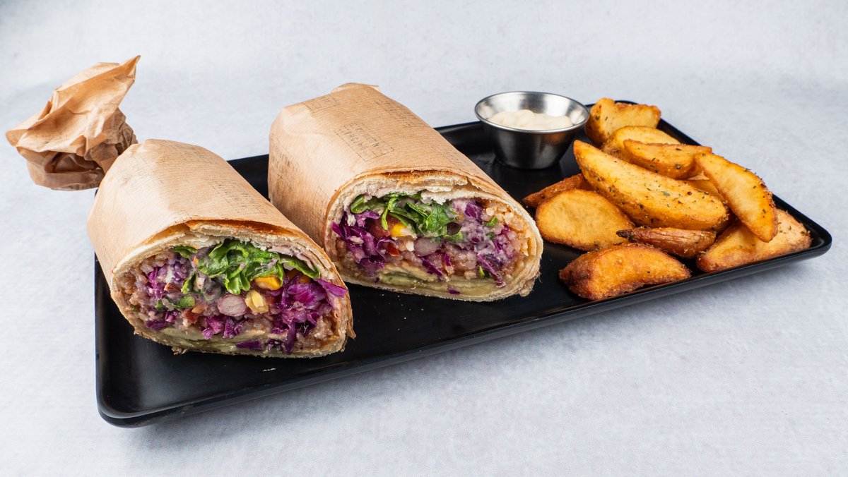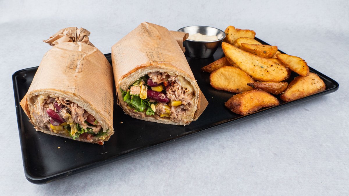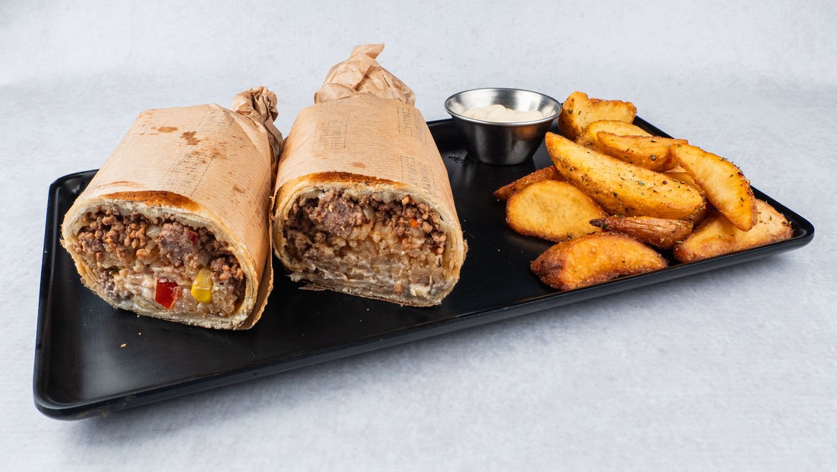Х5 ролована тортиља полнета со мелено јунешко месо, домат, кромид, павлака сос