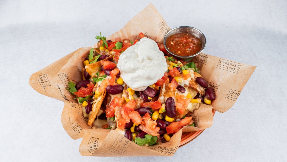 Начос чипс, кашкавал, домат, пченка, кориандер, црвен грав + сајд сос