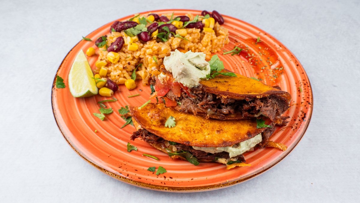 Тортиља, кашкавал, говедско месо бавно печено, кромид, кориандер, лајм