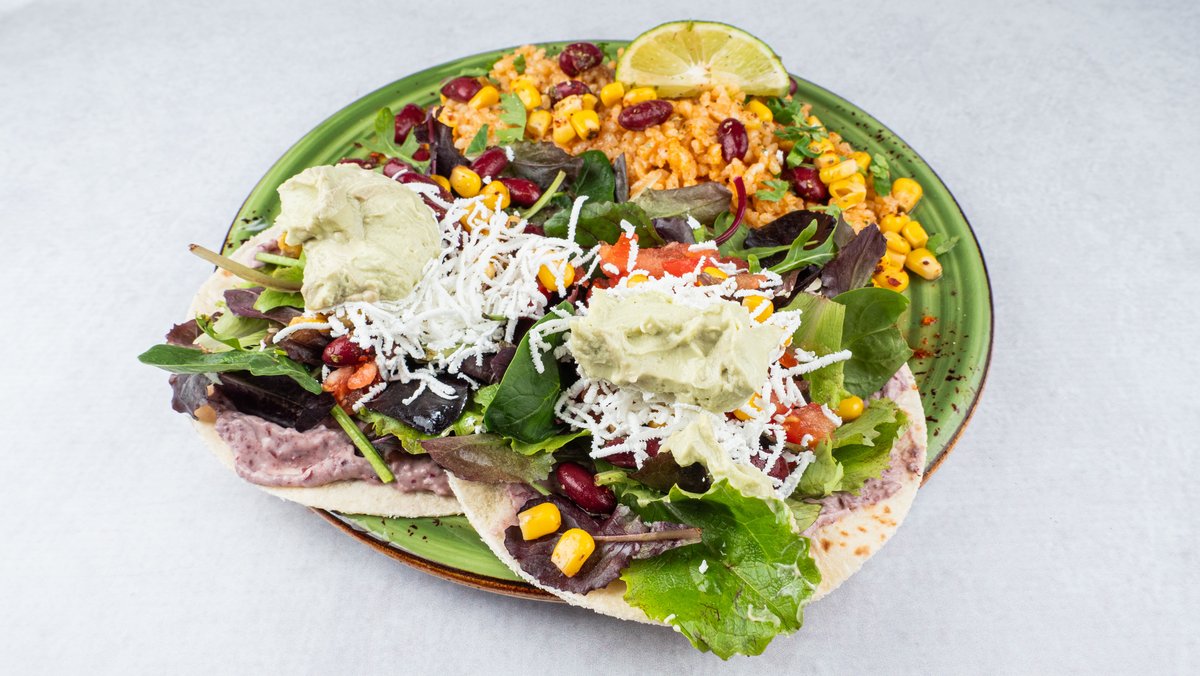 Тортиља, грав намаз, микс салата, пченка, домат, авокадо, сирење
