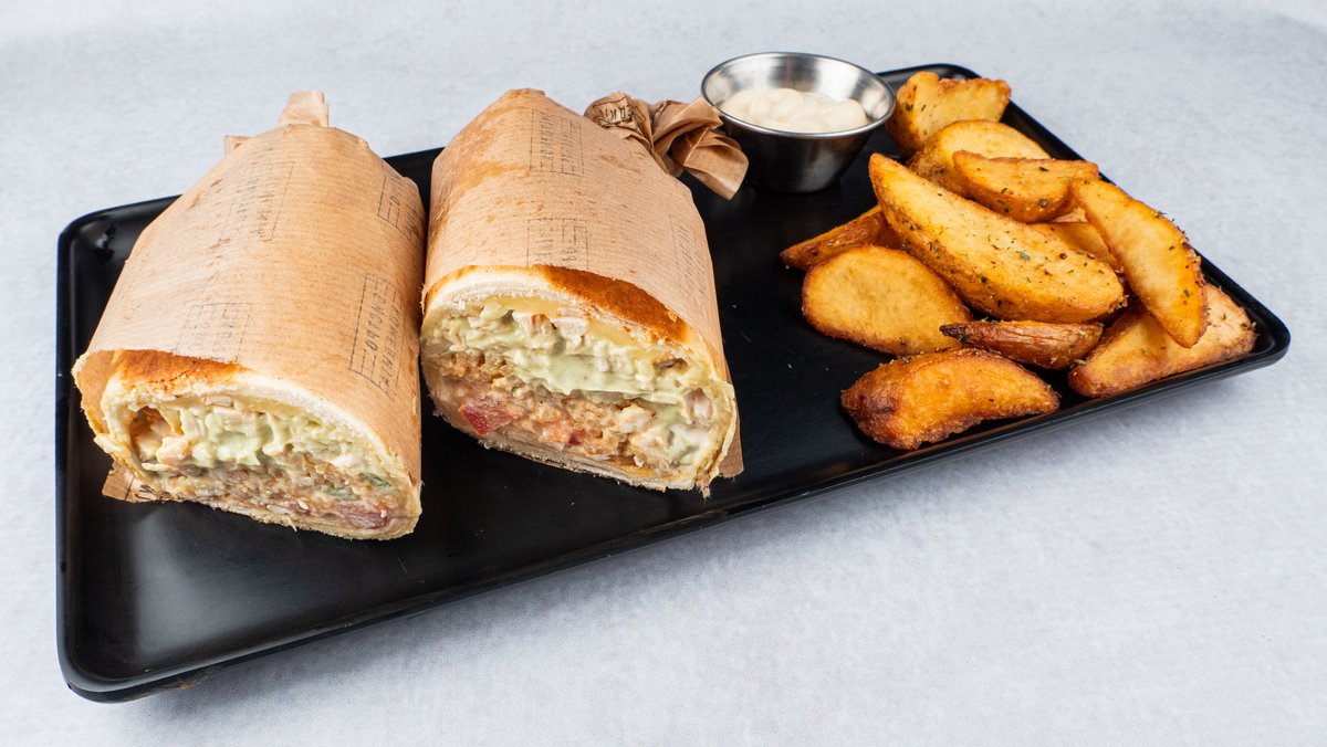 Пилешко месо, авокадо крем, кашкавал, ориз, пиперка, домат, мајо, сајд сос