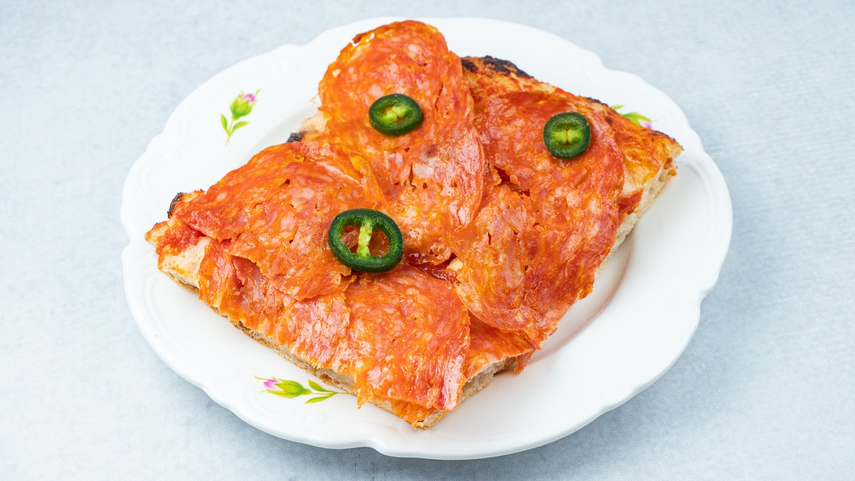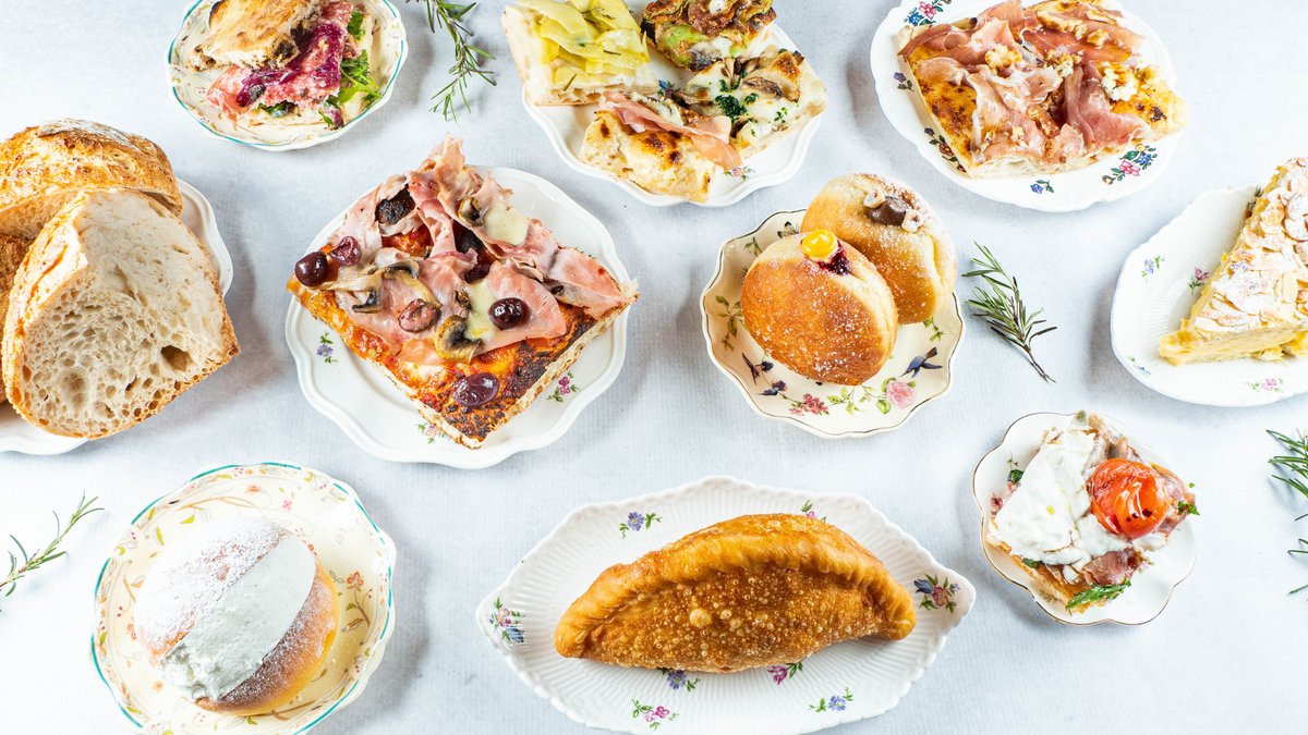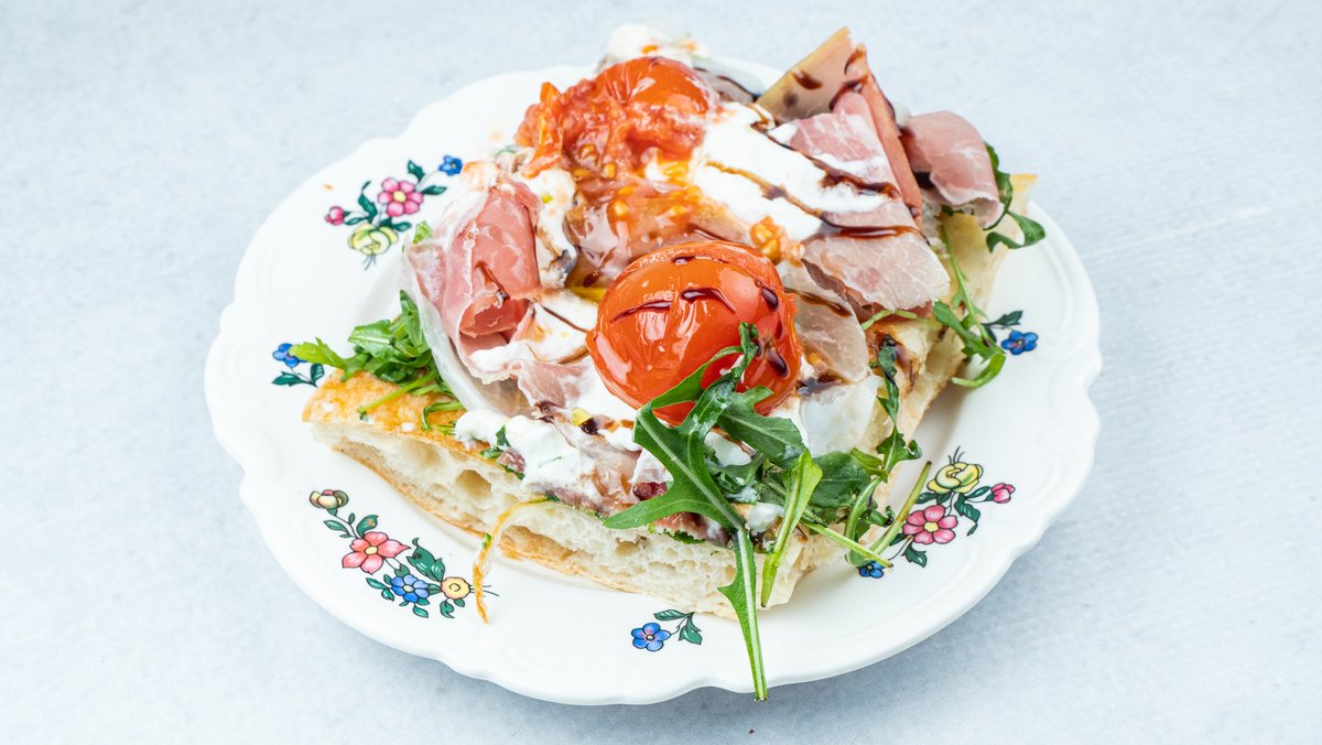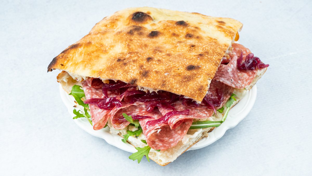 Фокача, салама, пекорино крем, карамелизиран кромид, џем од кајсија, рукола.