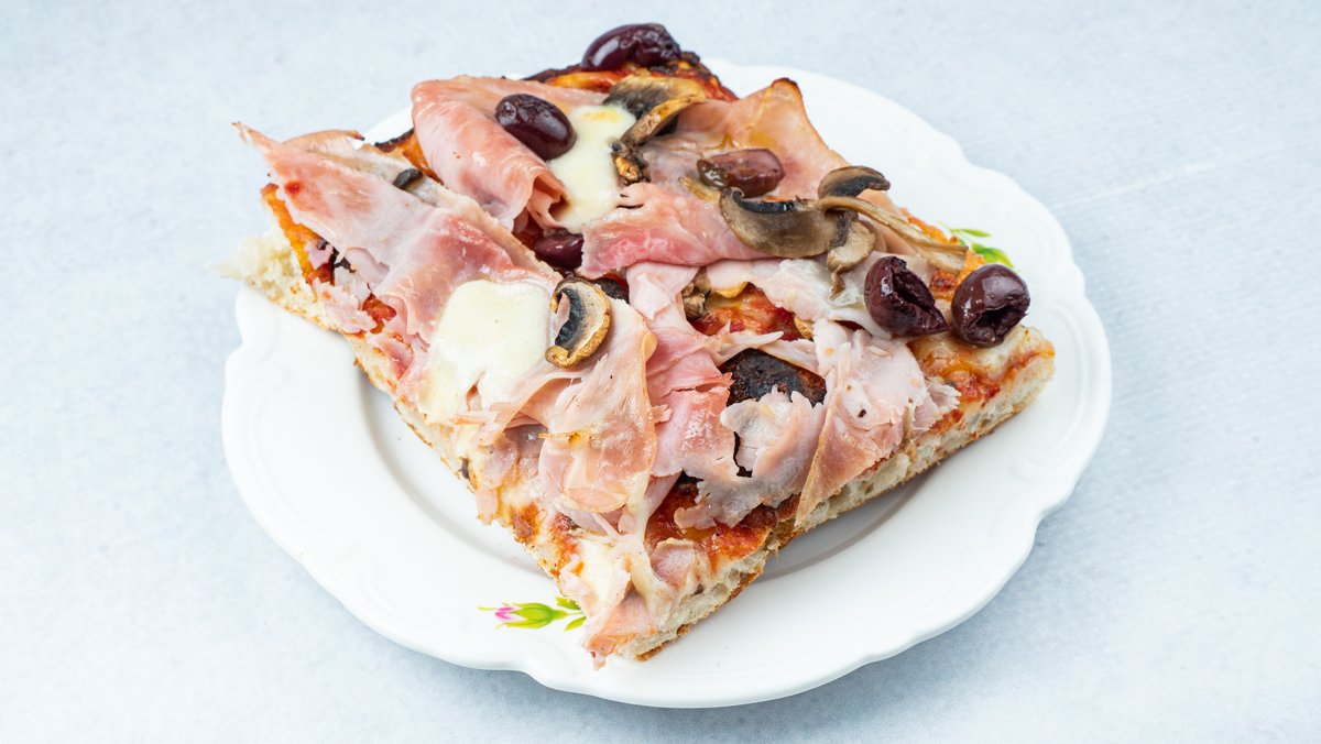 Моцарела фјор ди лате, домат, варена шунка (Negrini), црни маслинки, шампињони.