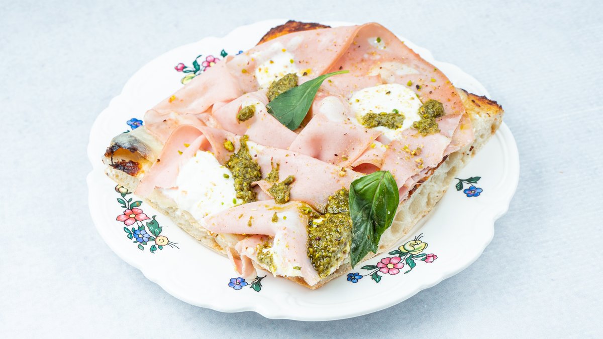 Моцарела фјор ди лате, пармезан крем, мортадела, страчатела, фстаци, песто.