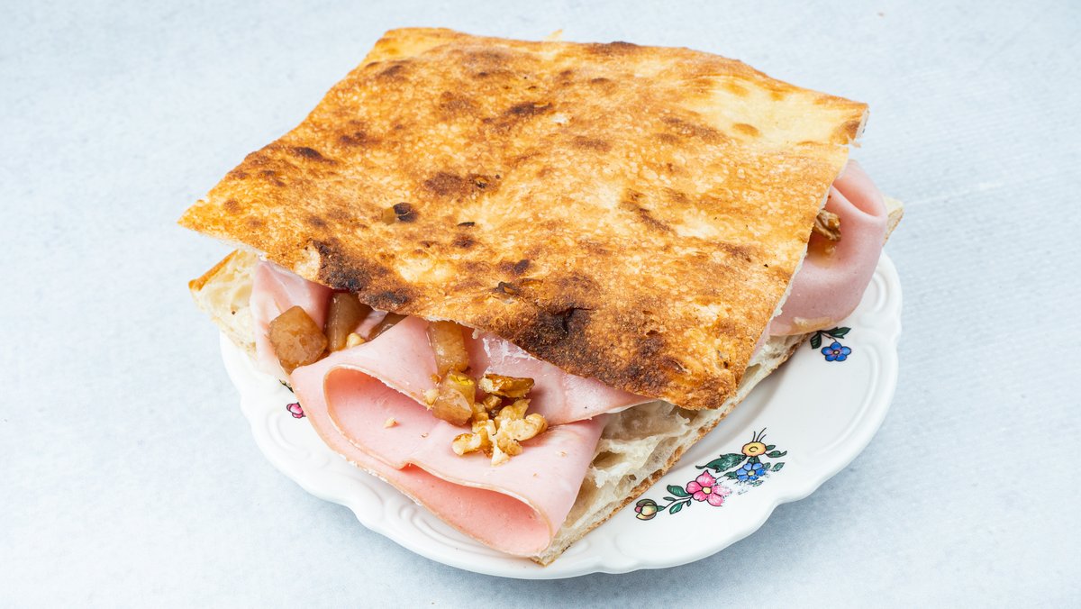 Фокача лепче, мортадела, балсамико крема глазирана крушка, крем од горгонзола, ореви.