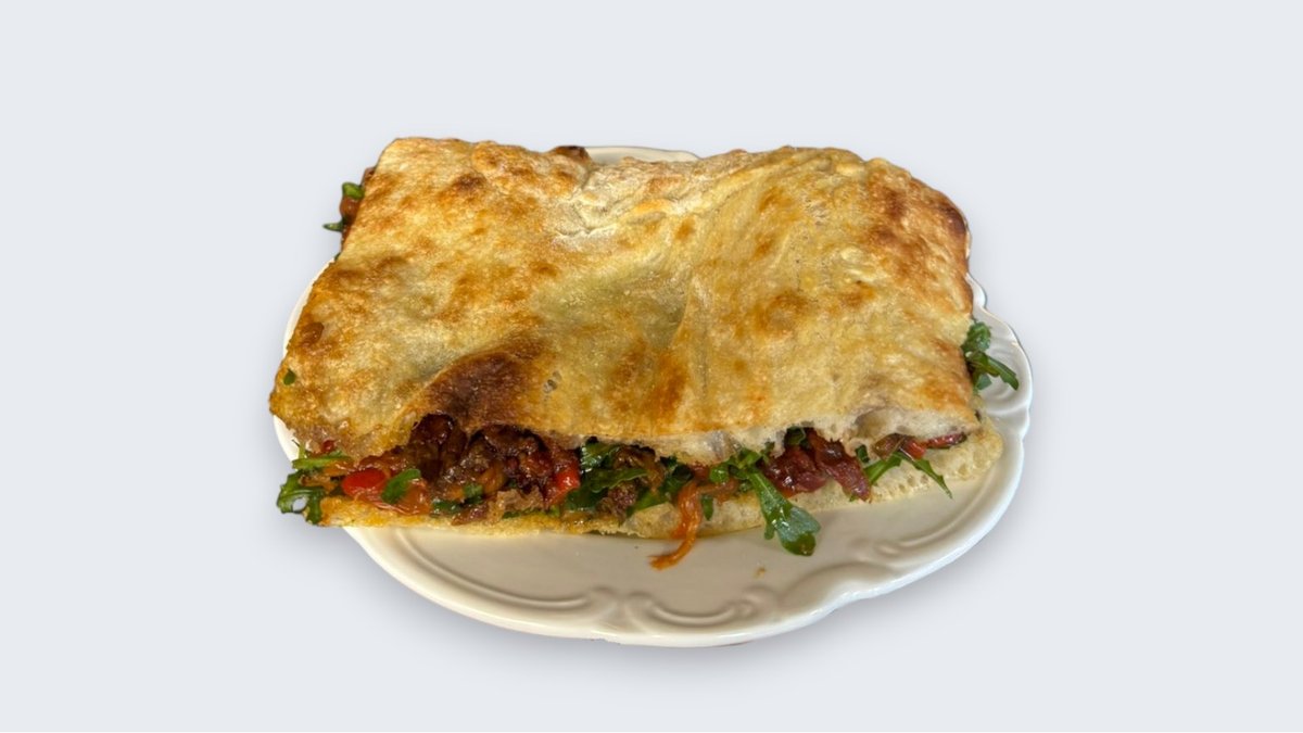 Фокача лепче, печени маринирани тиквички, печени маринирани пиперки, сушен домат, веге мајонез, рукола.