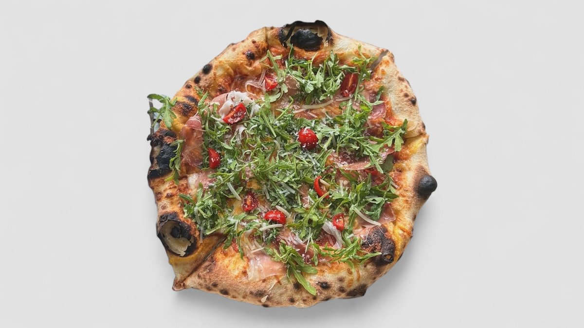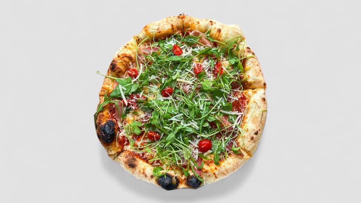 Доматен сос, кашкавал, пршут, рукола, шери домати, пармезан