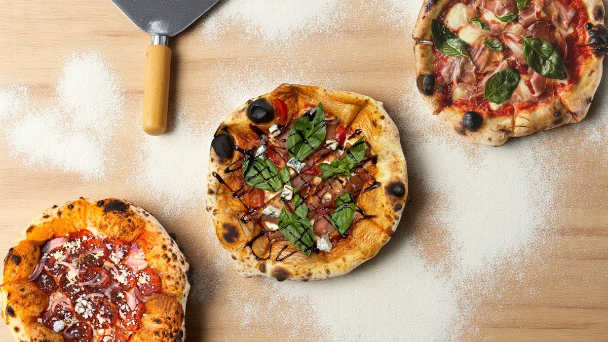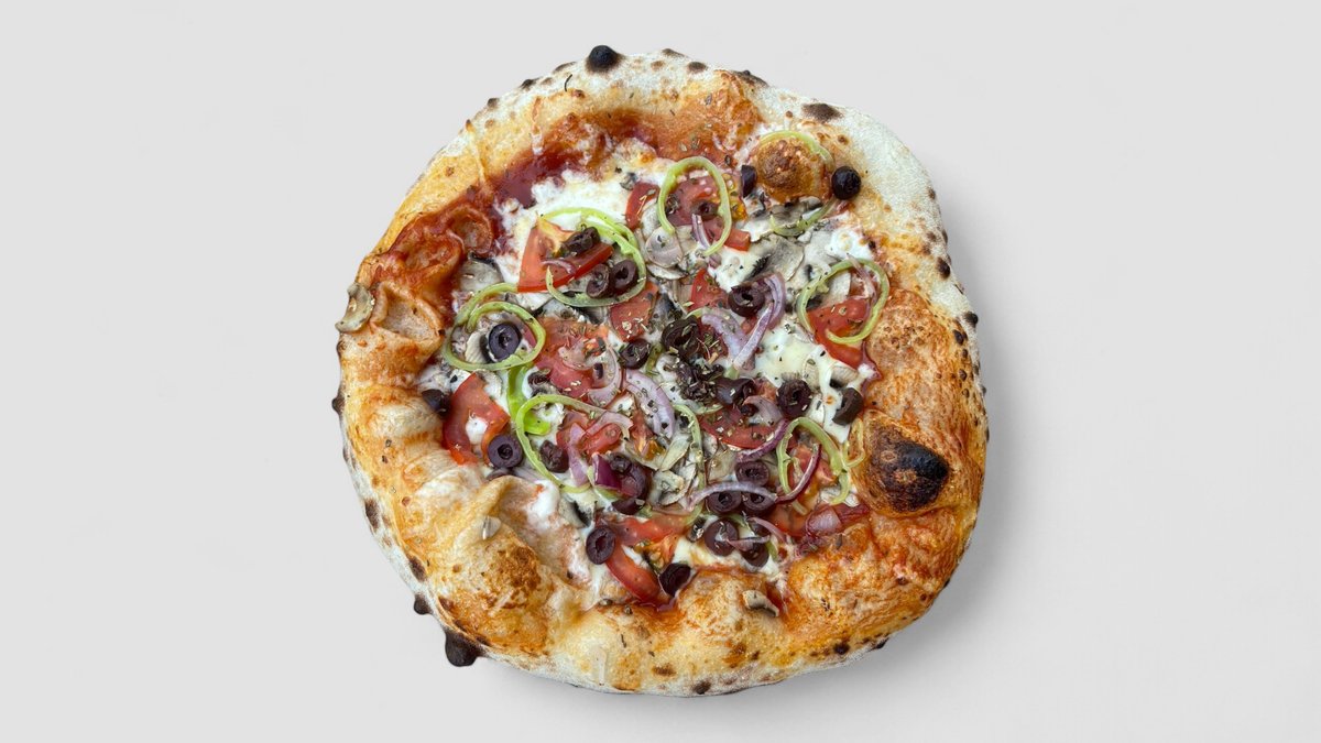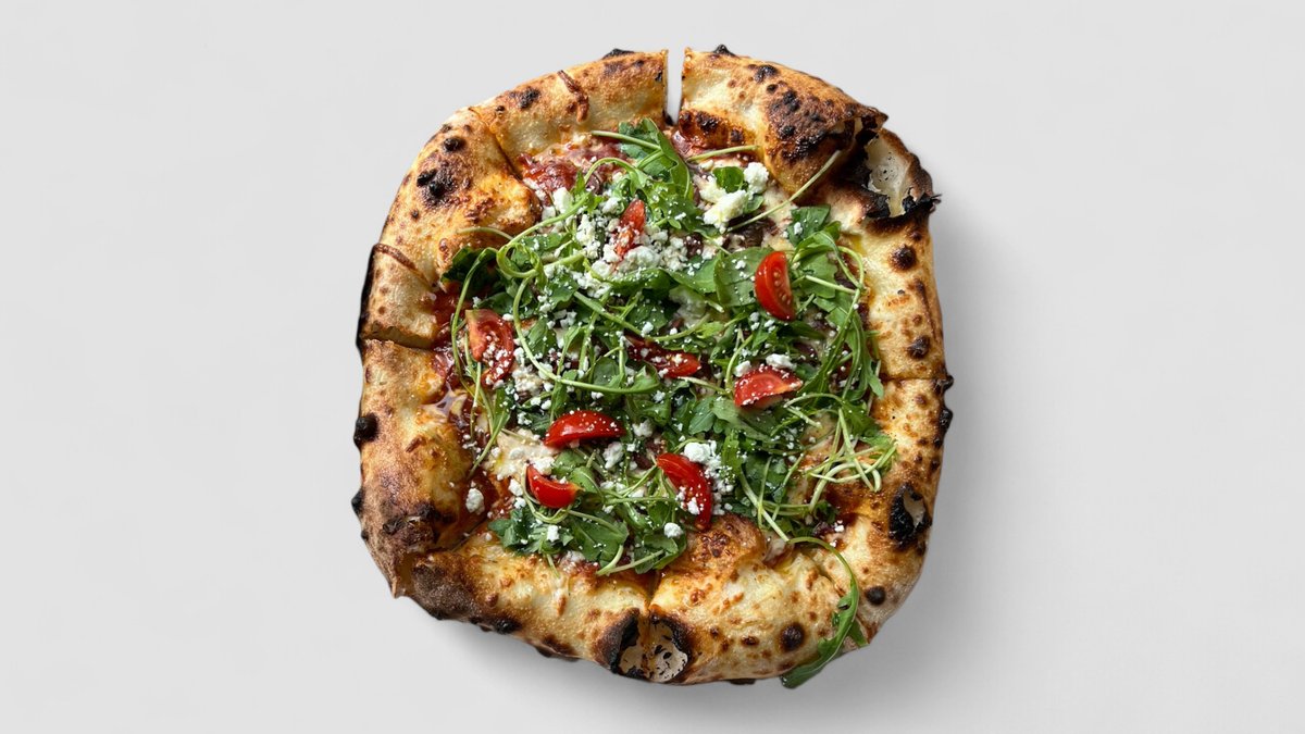 Доматен сос, кашкавал, маслинки, свеж лук, шери домати, бело сирење, рукола, маслиново масло