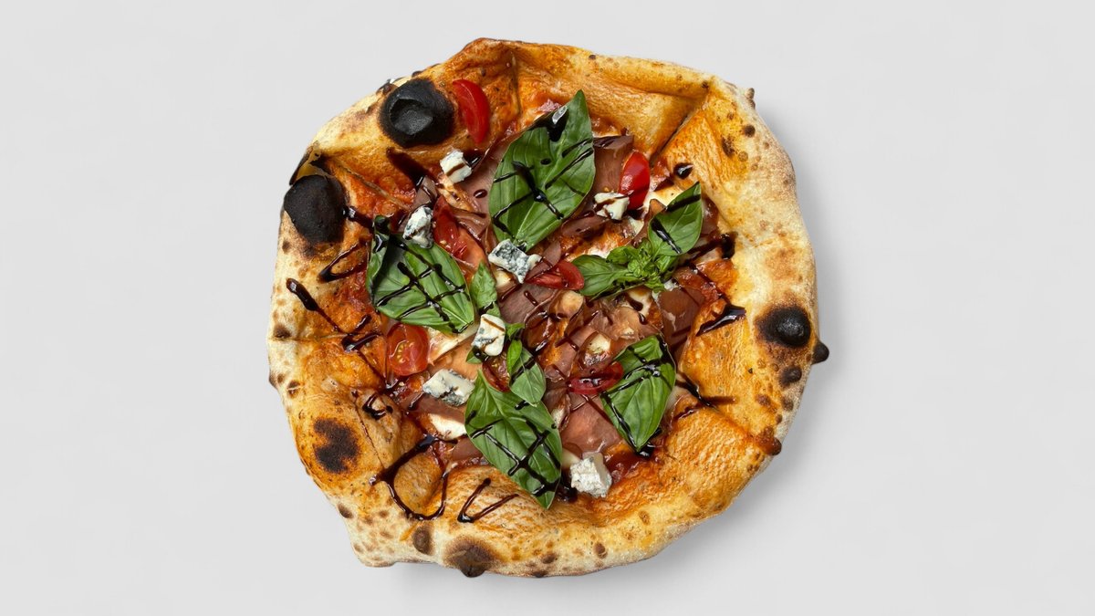 Доматен сос, свежа моцарела, говедски пршут, шери домати, свеж босилек, горгонзола и балзам крема со вкус на смоква
