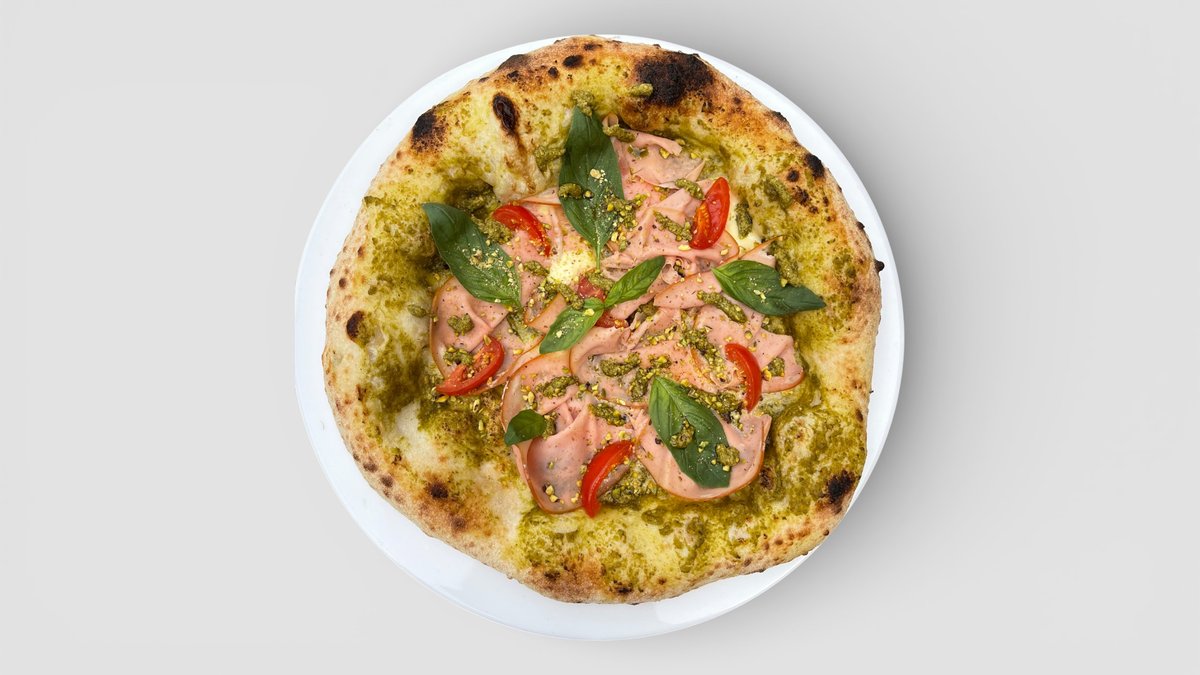 Песто, свежа моцарела, мортадела, фʼстак, босилек и шери