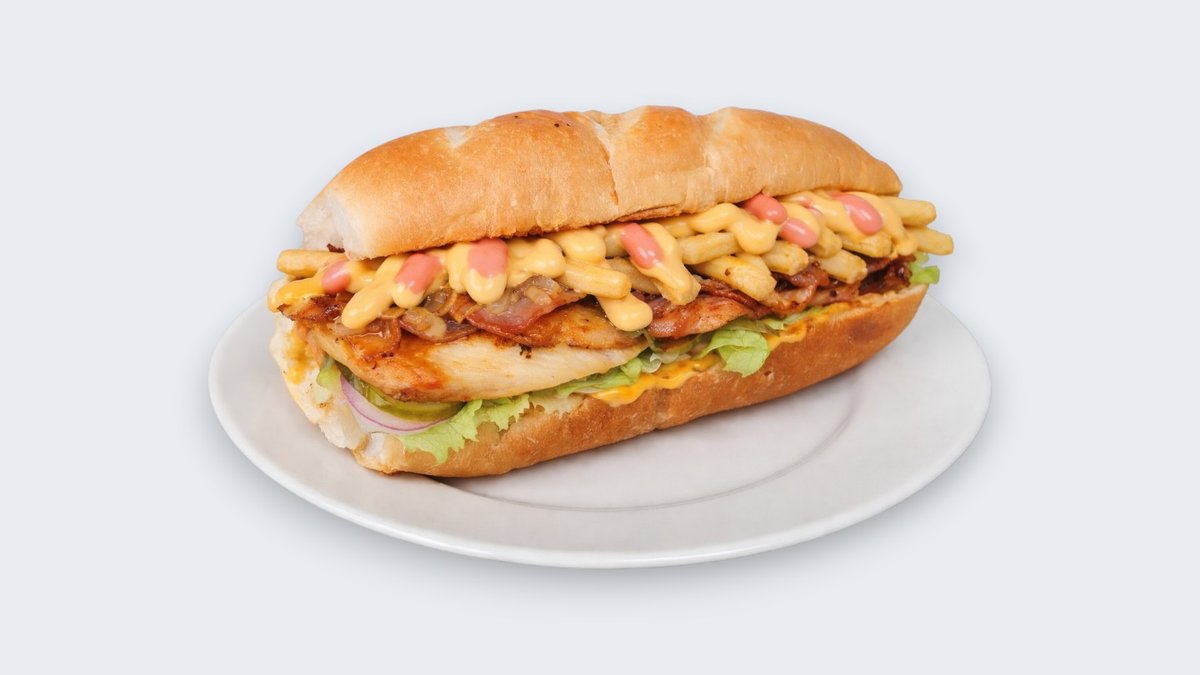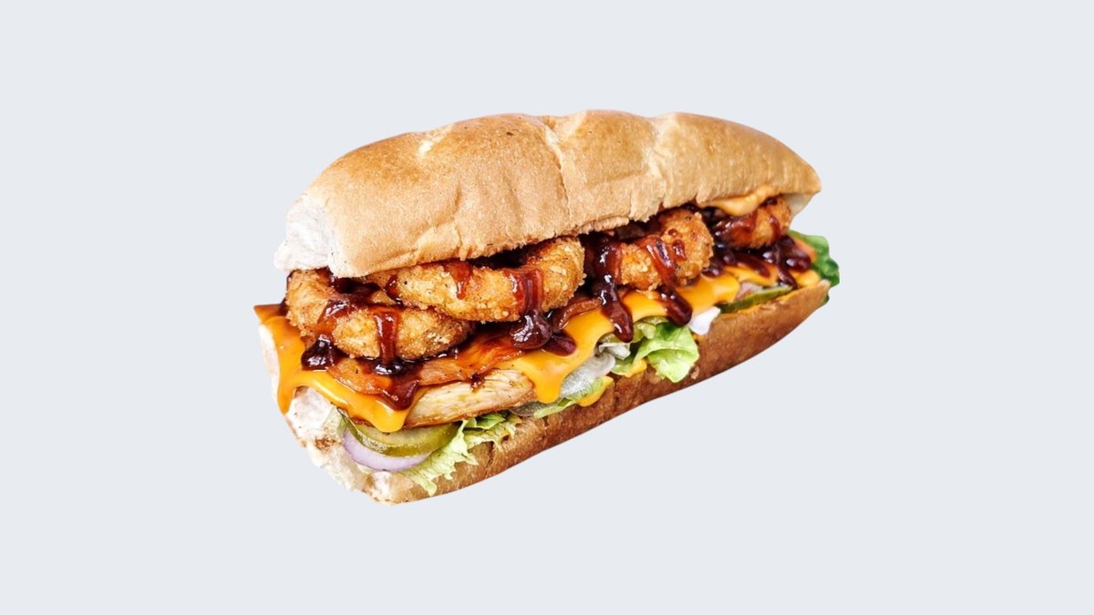 Бел багет, пилешко месо, сланина, топен чедар, 3 onion rings, корнишони, BBQ сос и мајонез