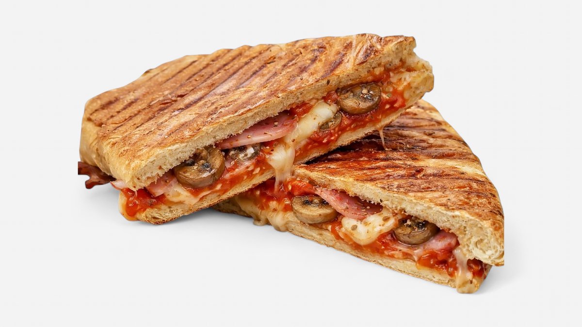 Долго лепче, шунка, сендвич моцарела, гауда кашкавал, печурки и доматен сос со оригано