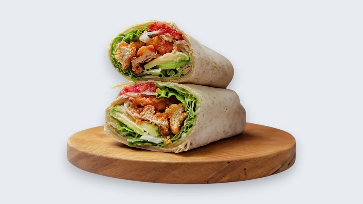 Тортиља, пилешко месо, авокадо, пченка, марула, домат, кромид, корнишони, тартар и лут сос