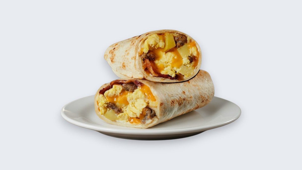 Тортиља, омлет од две јајца, две тенки кобасици, сланина, марула, домат, краставица, тартар сос и сенф
