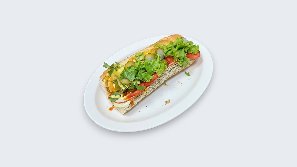 Похована виршла, марула, домат, корнишони, кромид, сендвич сос и кари сос