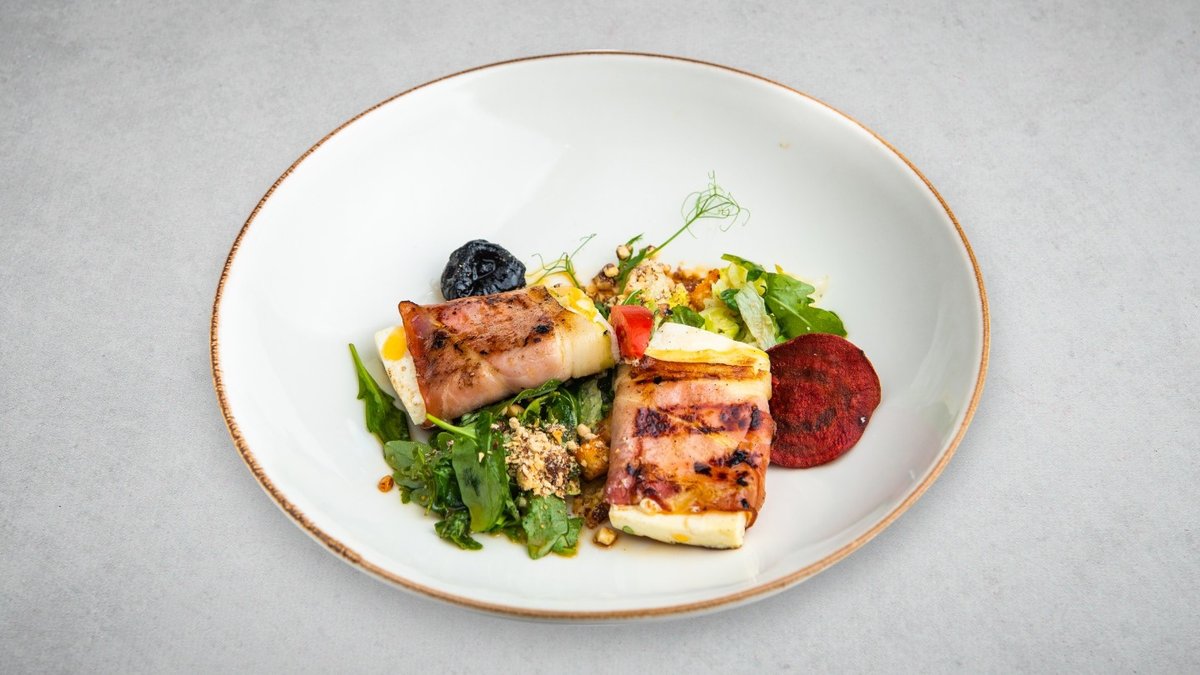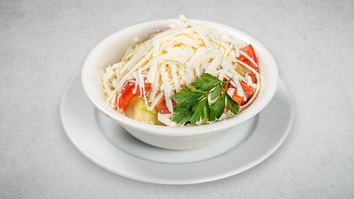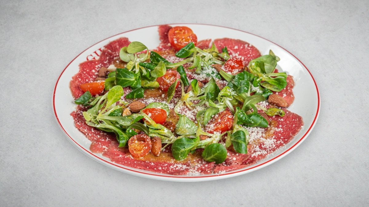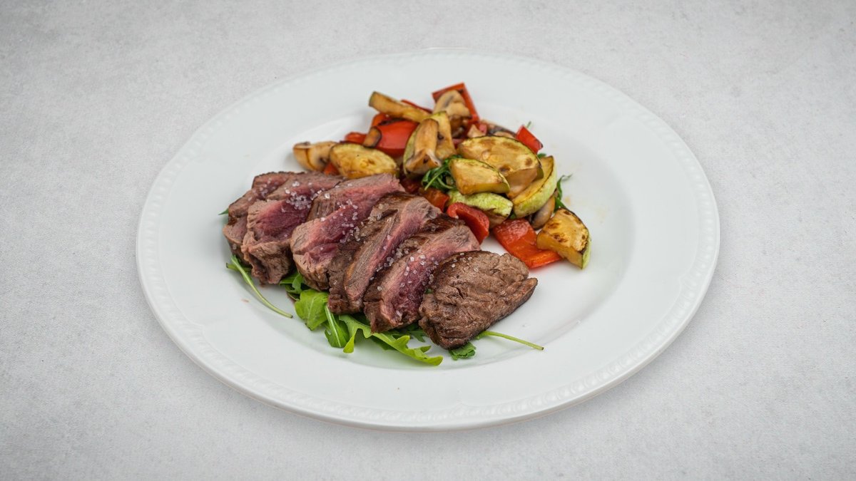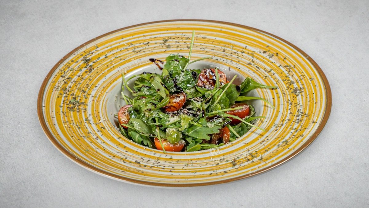 Дресинг, ајсберг, сув домат, рукола, бифтек, шери домат, кубети