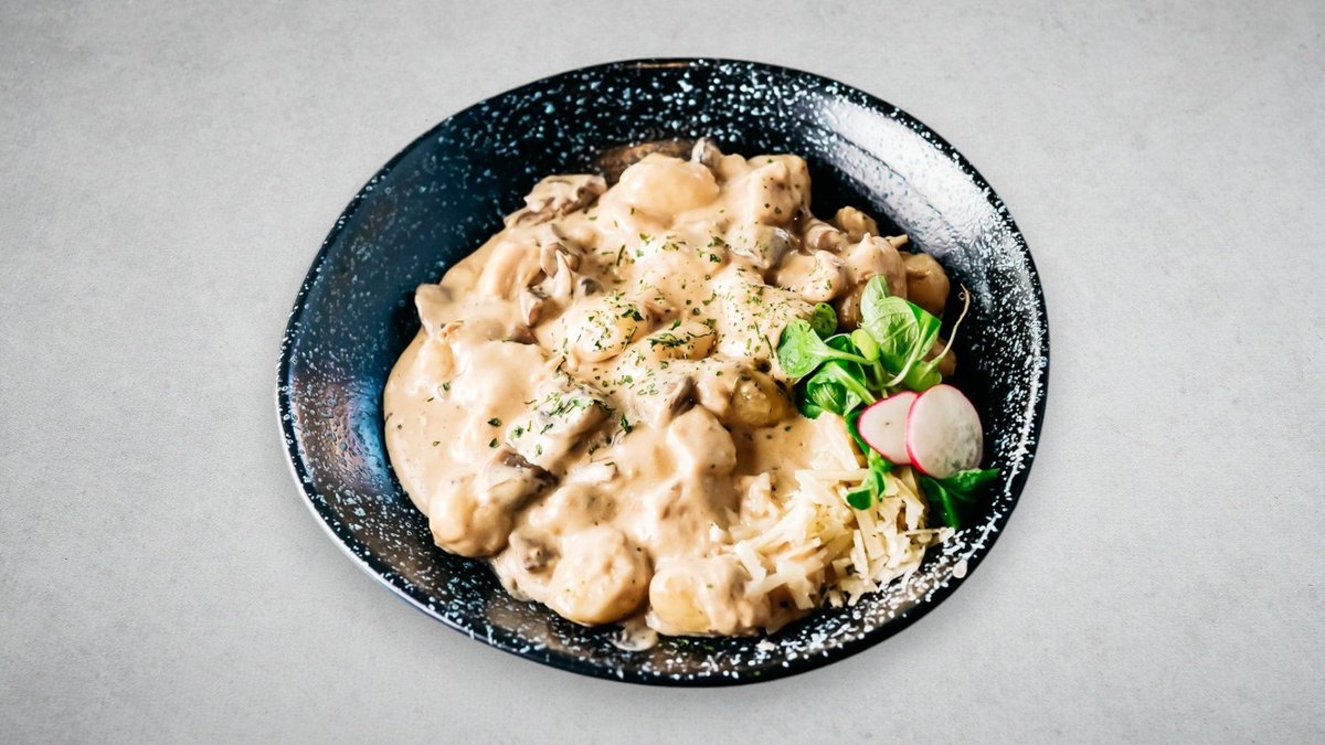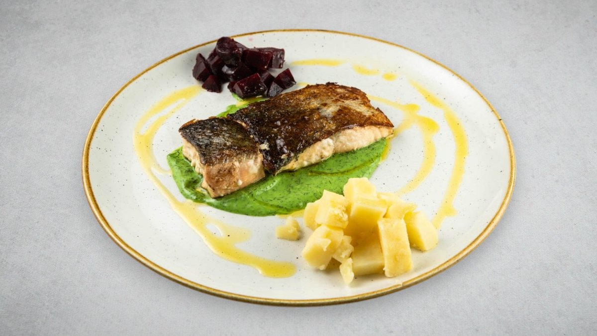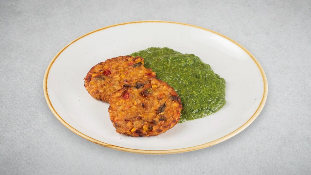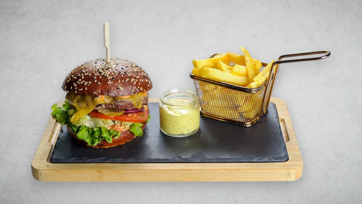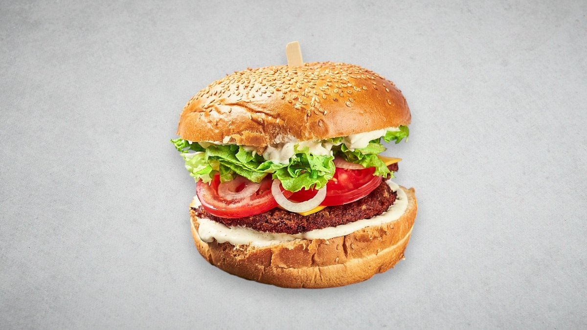Цвекло, плескавица соја, помфрит, кисели краставички, веган кашкавал