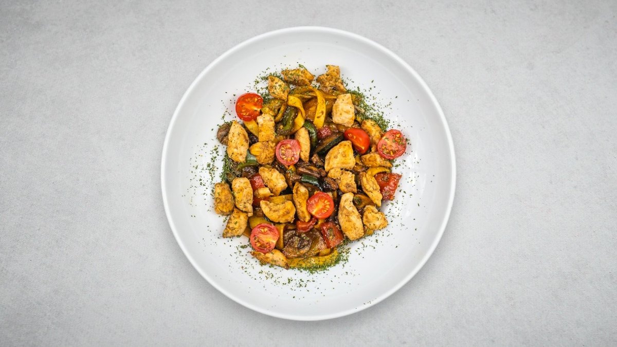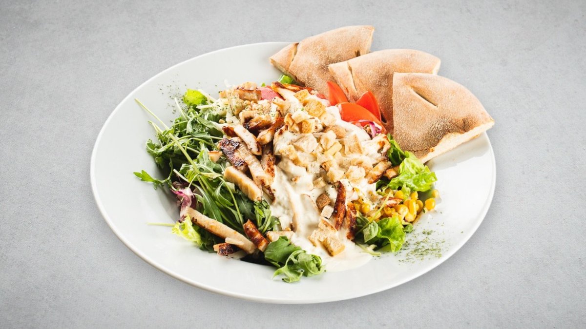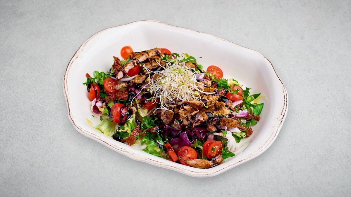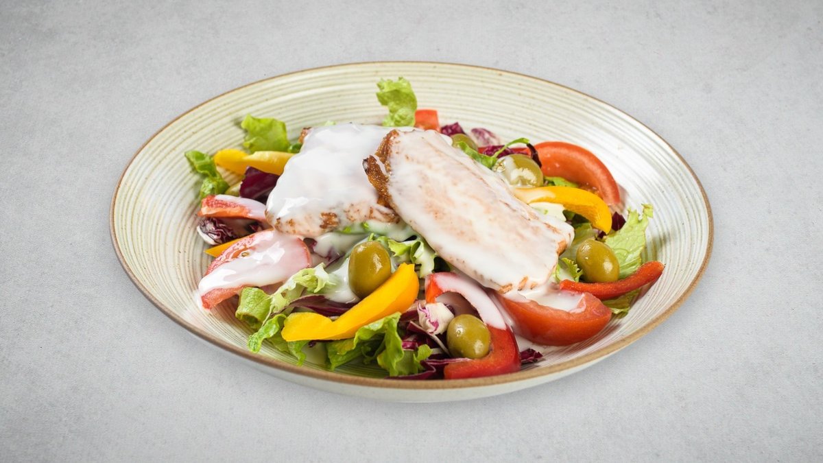 Ајсберг, марула, рукола, дресинг, кубети, шери домат, пилешки стек