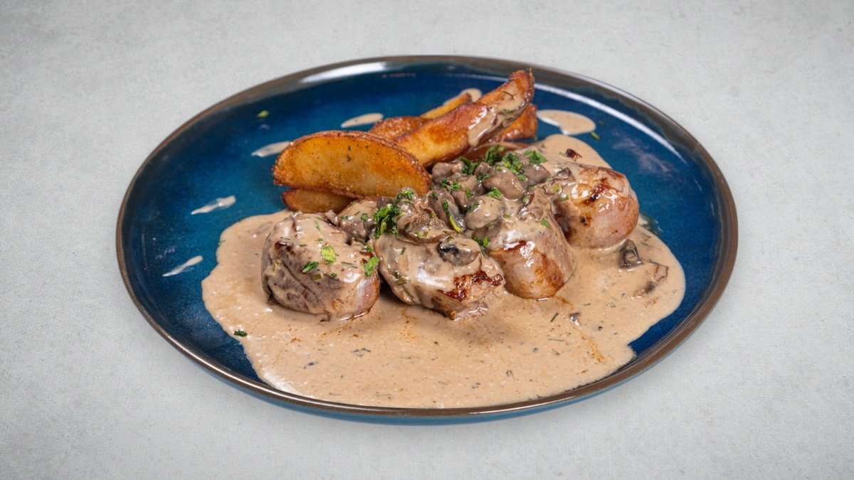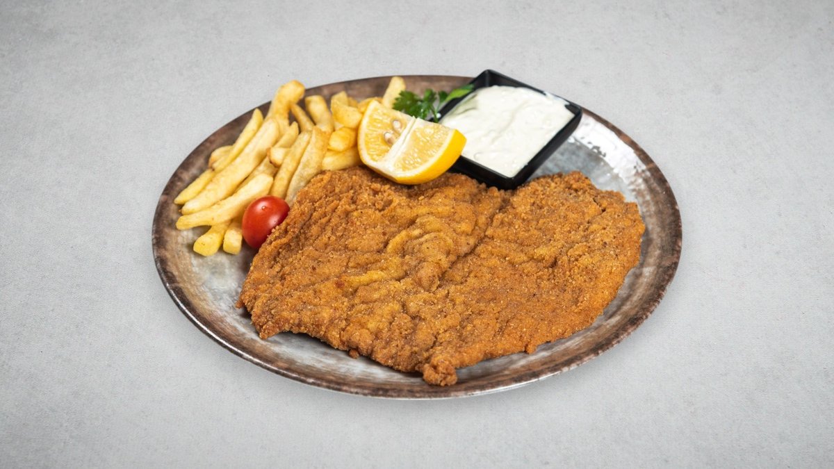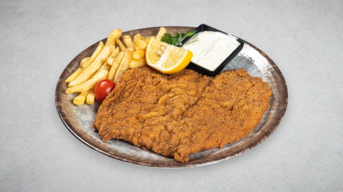Презла, пилешки стек, бургер сос, домат, ајсберг, помфрит