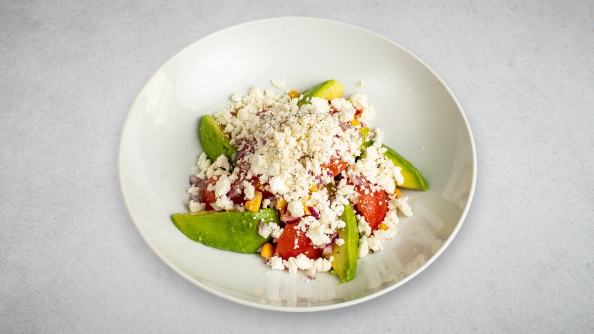 Авокадо, шери домат, јајца препелица, ајсберг, радич, дресинг, киноа