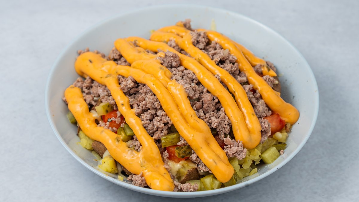 Домат, кисели краставички, мелено јунешко месо, бургер сос